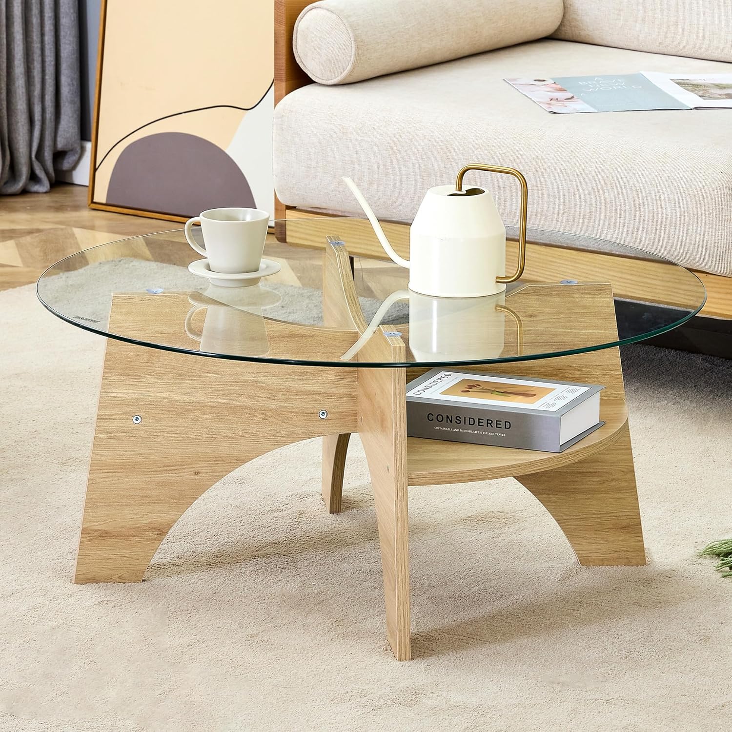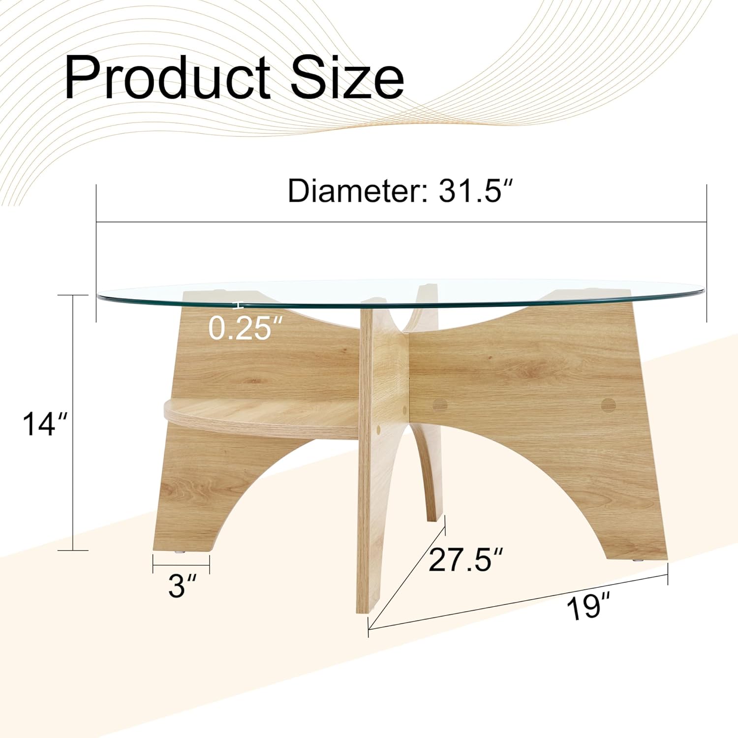 31.5" Round Glass Coffee Table with Tempered Glass Top and MDF Base, Diagonal Fan-Shaped Tray Design Table Leg Simple & Modern Center Table for Living Room Office Apartment Wood