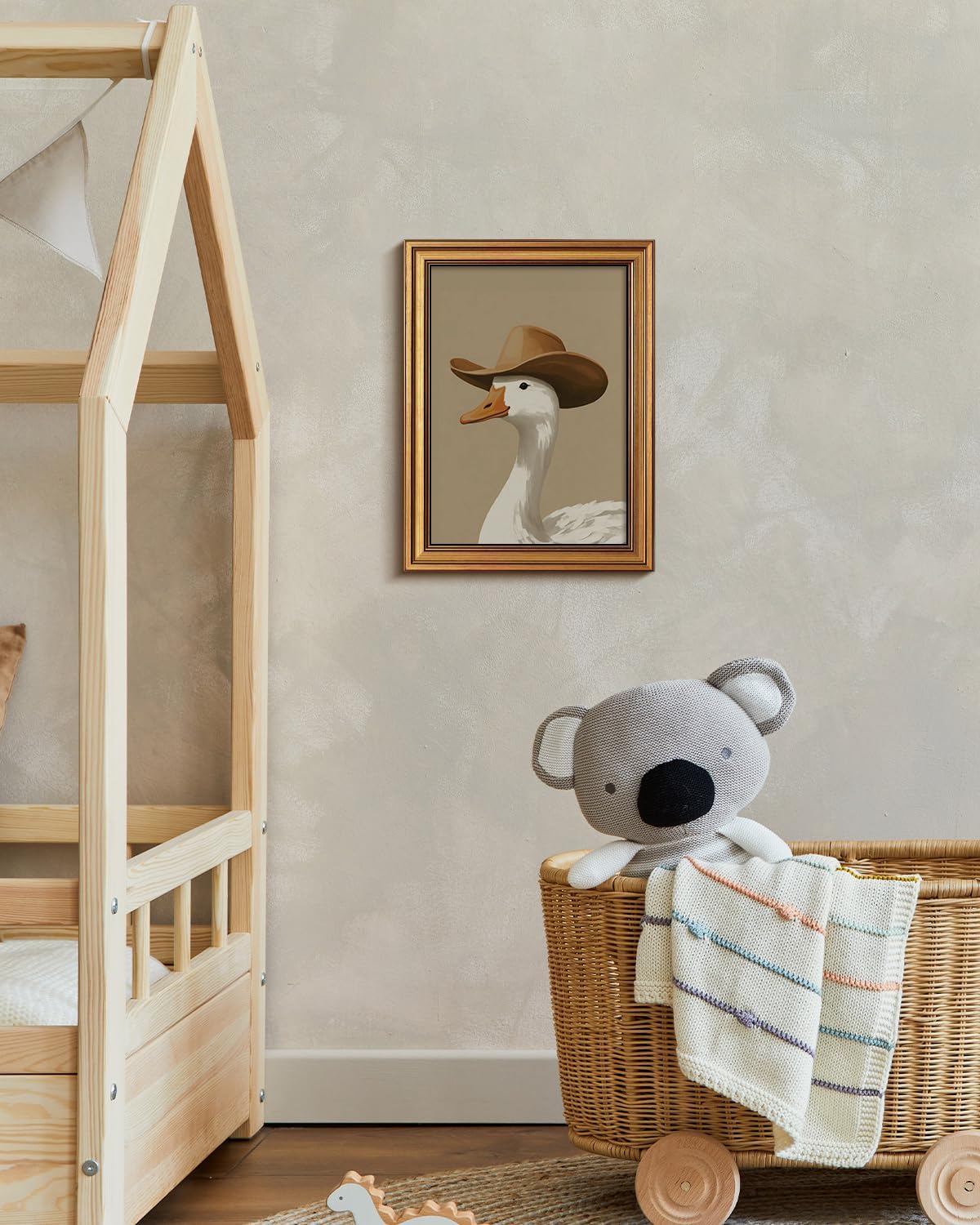 - FUNNY & UNIQUE DESIGN: This whimsical artwork wall art print portrays a white duck wearing a cowboy hat, exuding a unique personality and playful charm, Reminiscent of a Western cowboy. The warm earthy tones, combined with a vintage gold frame, make this an ideal piece for living rooms, offices, or farmhouse. More than just a painting, itโs a statement of humor and individuality, perfect for those who appreciate lighthearted and quirky home dรฉcor