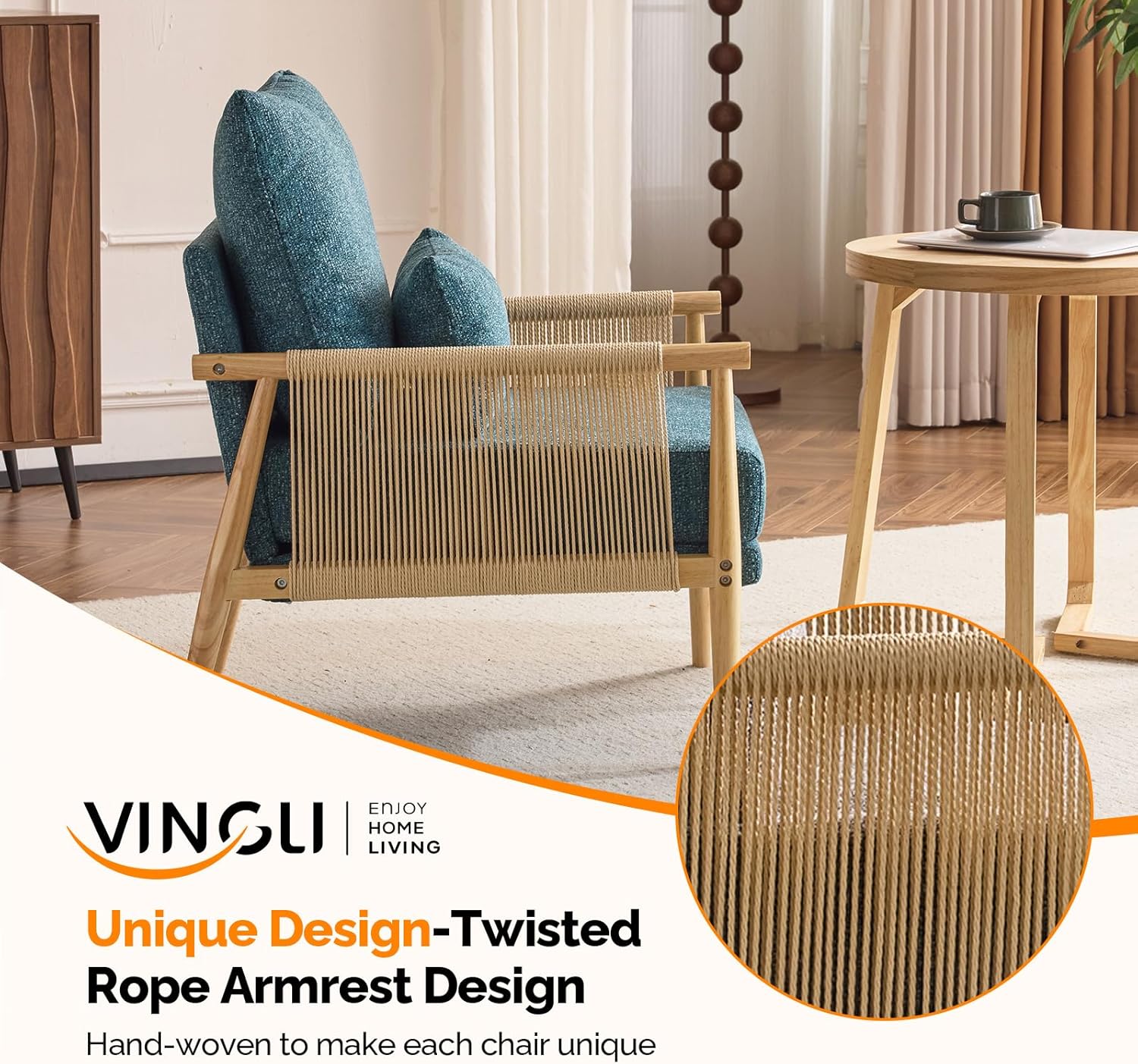 VINGLI Boho Braid Accent Armchair,Mid-Century Modern Chiar with Solid Wooden Armrest,Comfy Louge Cushion Chair with Waist Pillow for Bedroom,Living Room,Reading Room, Teal