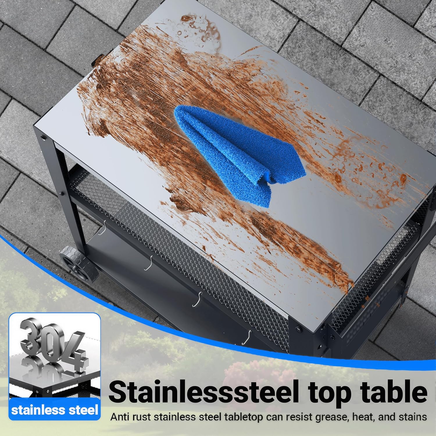 - Stainless Steel Top: The rust-proof stainless steel tabletop resists grease, heat, and stains. Wipe it down with a damp cloth for easy cleaning. The scratch-resistant surface maintains its appearance over time