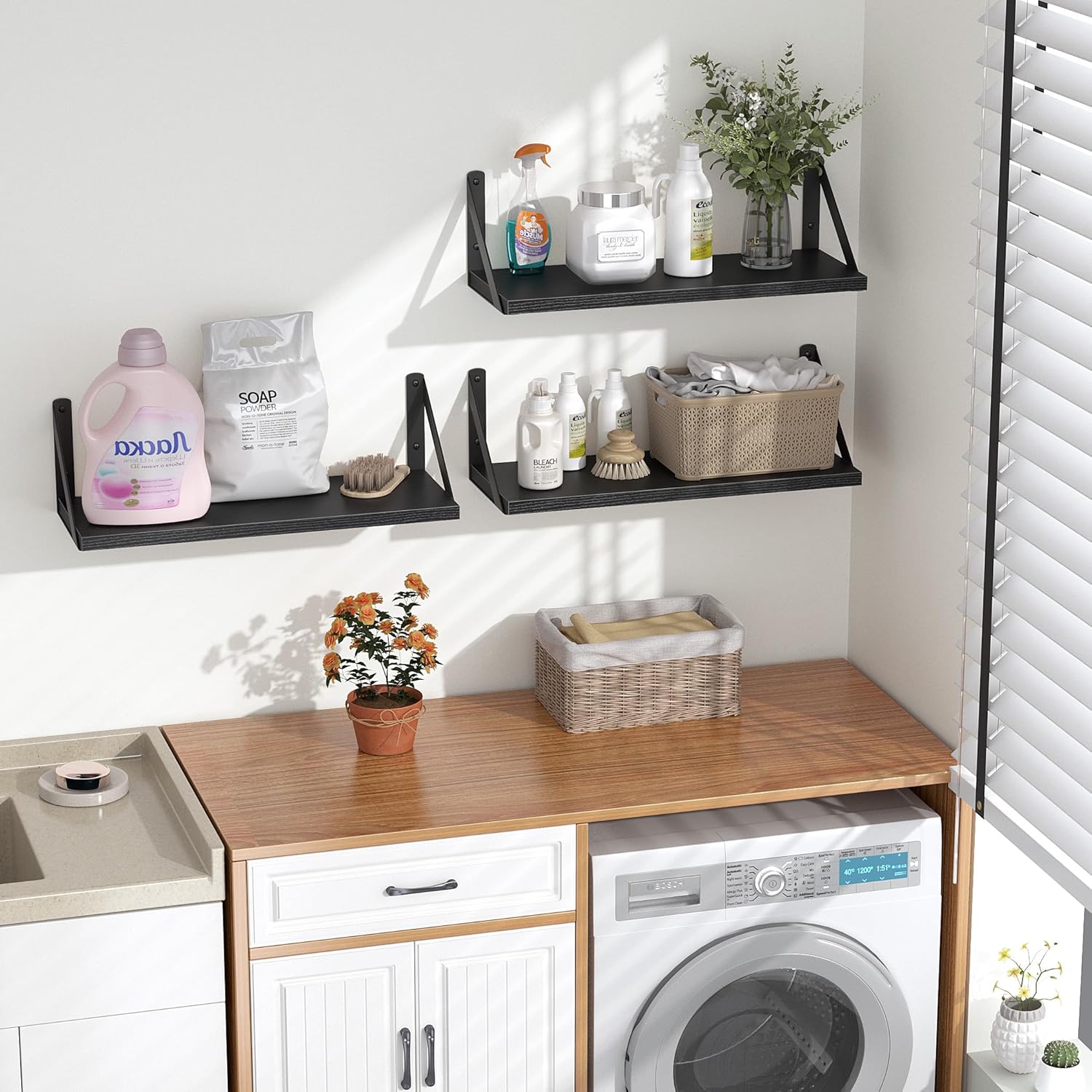 - 【MULTIFUNCTIONAL WALL SHELF】The floating shelves can turn a small area into an organized space, providing storage space for bedroom, bathroom, kitchen, easily placing greenery, books, crafts, spice jars, toiletries