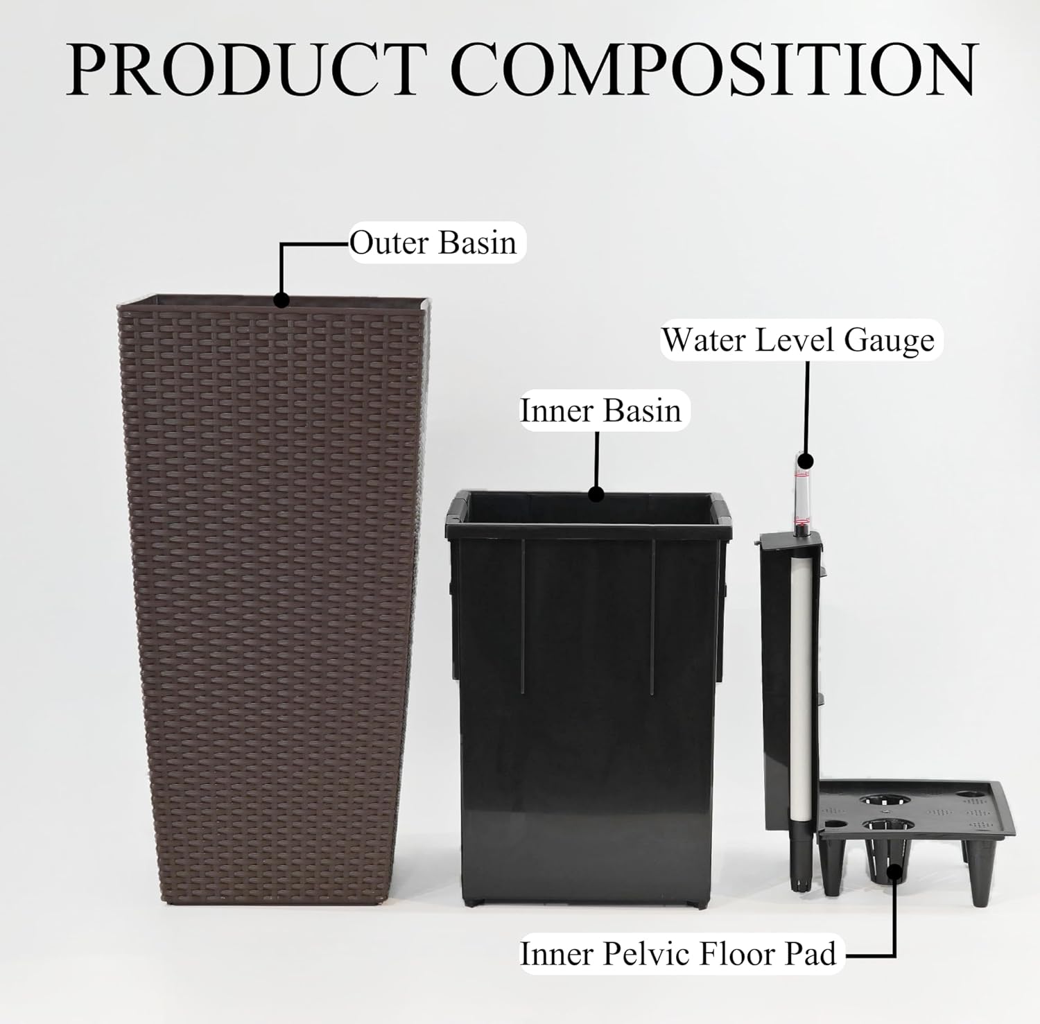 30in Tall Large Plant Pots Planter-Self-Watering Indoor/Outdoor Planting with Drain Holes, Water Level Monitor, Inner Bucket for Front Porch Patio, Brown Large
