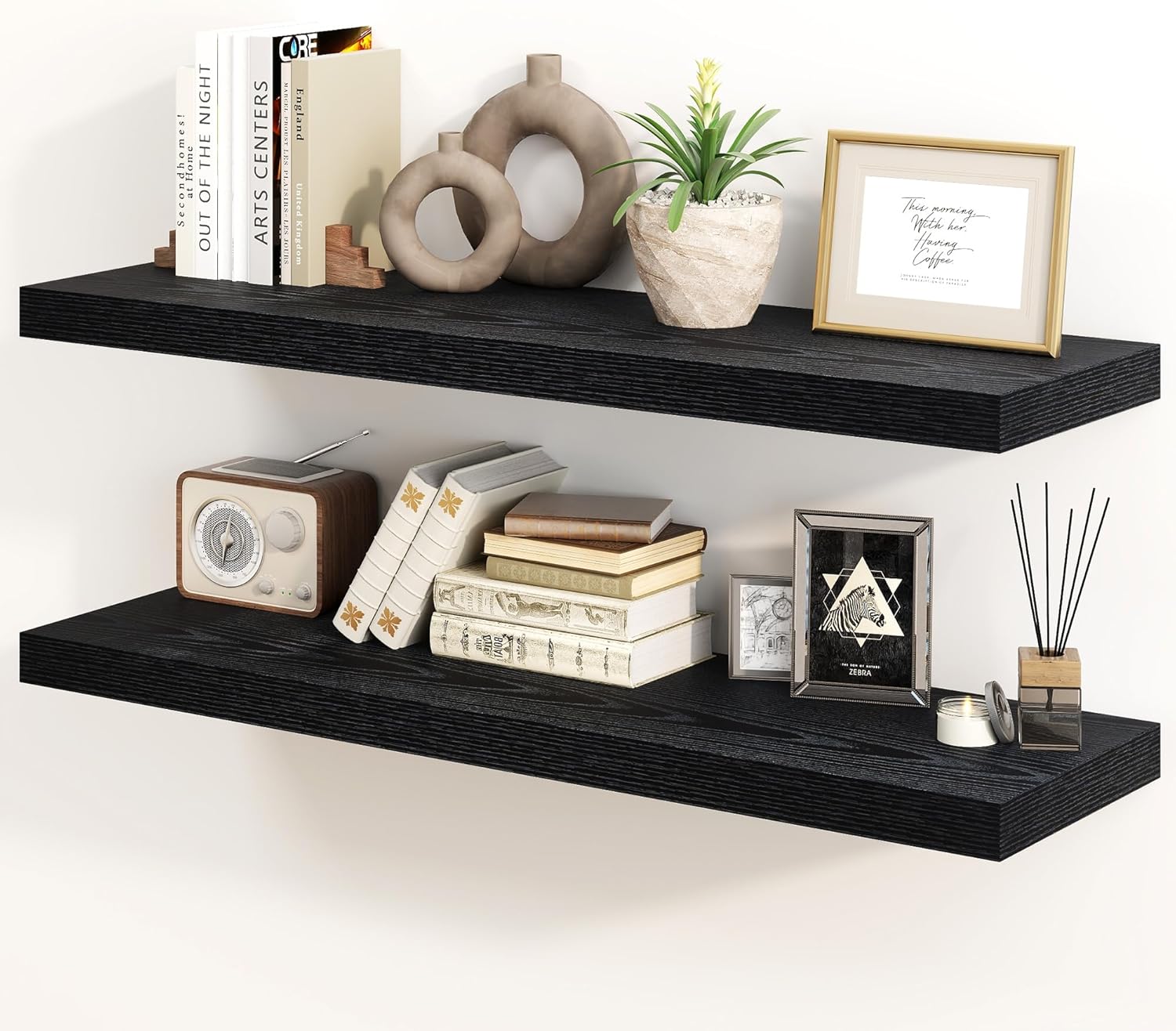 - 【DECORATIVE & FUNCTIONAL】The wall-mounted floating shelves are designed for decoration and storage, utilizing and decorating any space in your home. Used as shelf decor to show your collection, books, or prize, the hanging shelves are perfect for displaying your photo frame, small plants, model, or audio in your living room, office, study. And can also use as over the toilet storage shelf in the bathroom to hold toiletries or used as kitchen shelf to storage condiments.