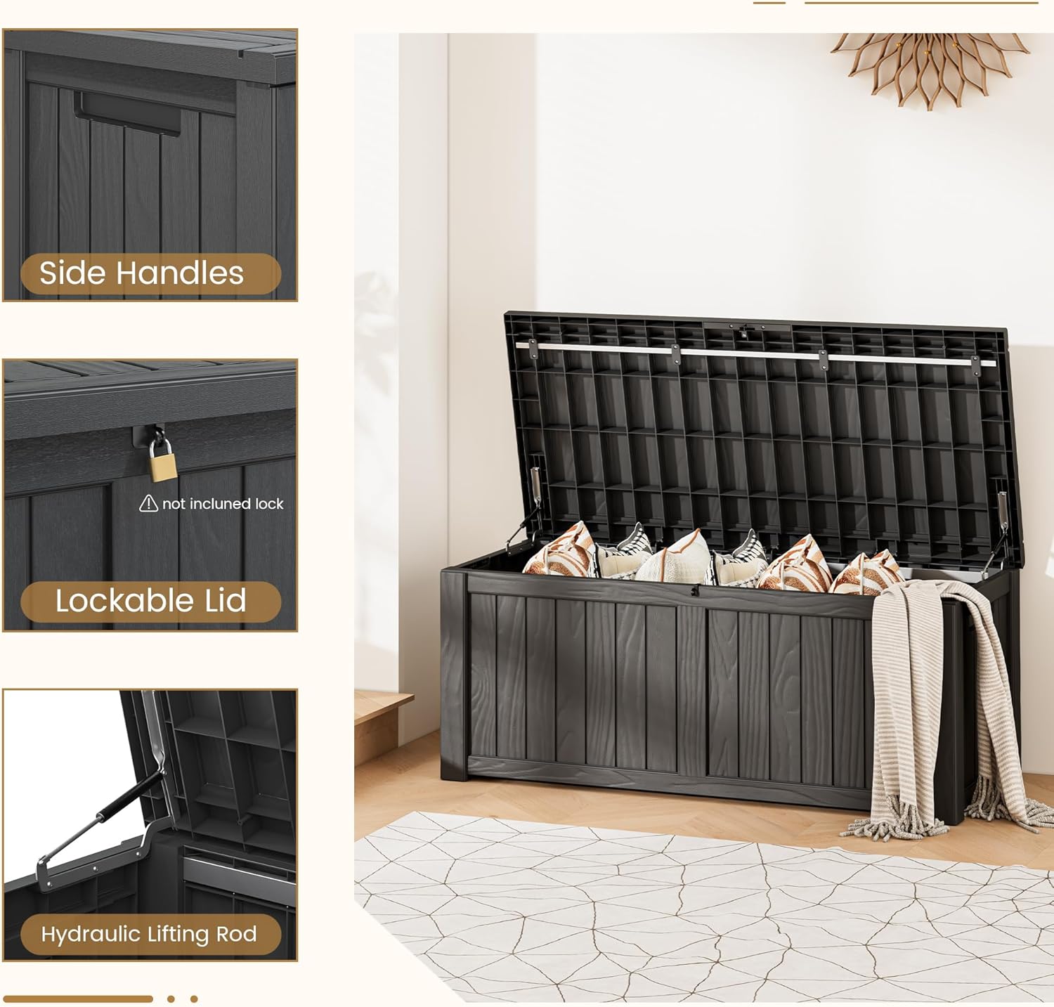 - Stable and Weather-Resistant - Crafted from upgraded resin material, this deck box is built to withstand the elements. Its waterproof and fade-proof exterior ensures long-lasting durability, keeping your belongings dry and protected, no matter the weather conditions.