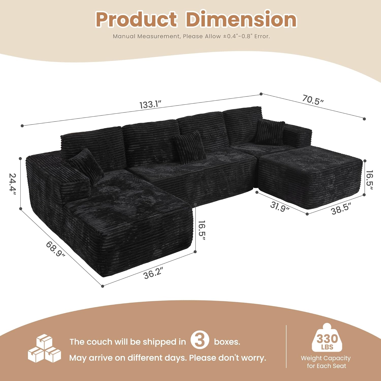 HOOOWOOO Cloud Sectional Couches for Living Room,Modular Sectional Sofa No Assembly,133X70 Inch Plush Corduroy Large U Shaped Floor Couch Set with Deep Seat Chaise Ottoman(Black)