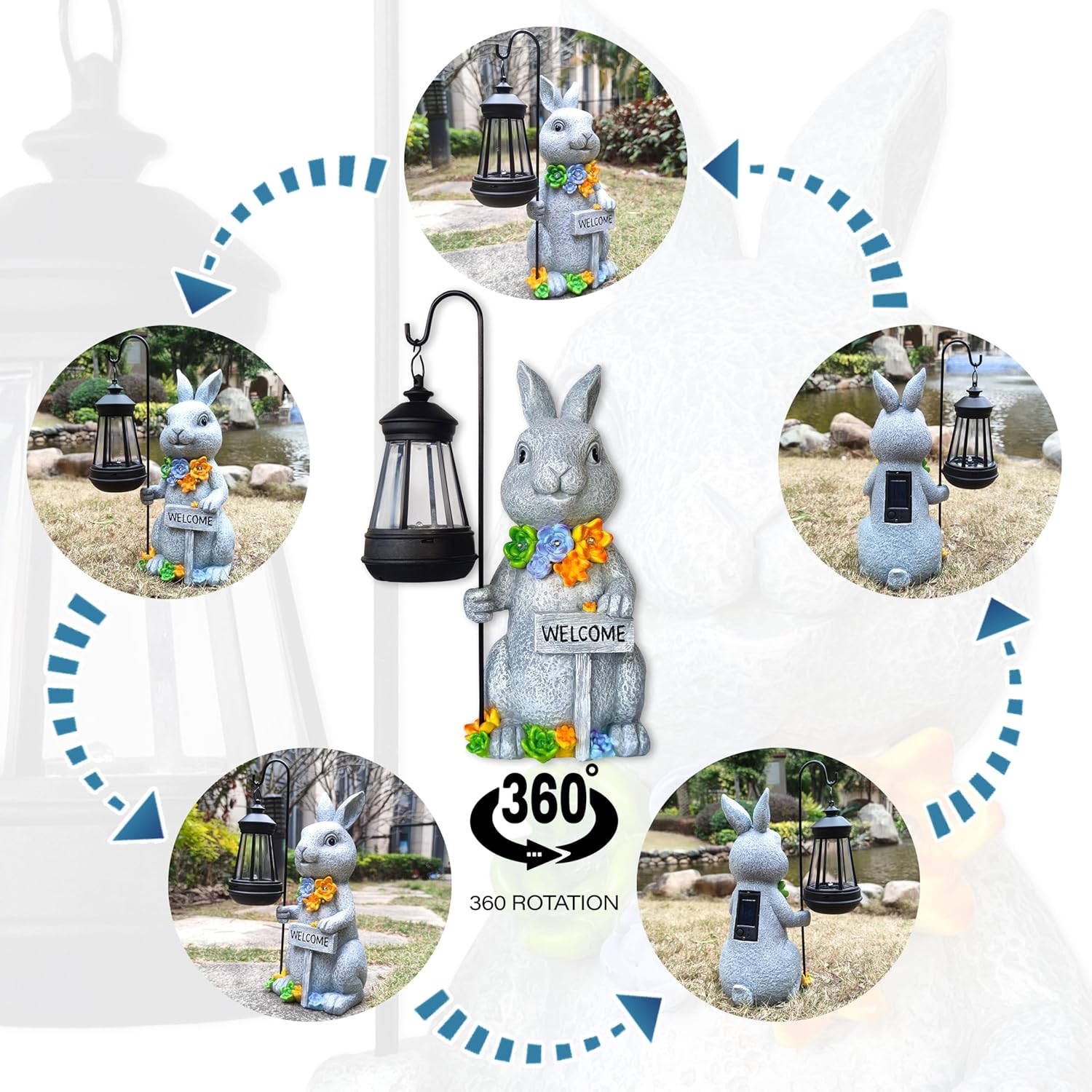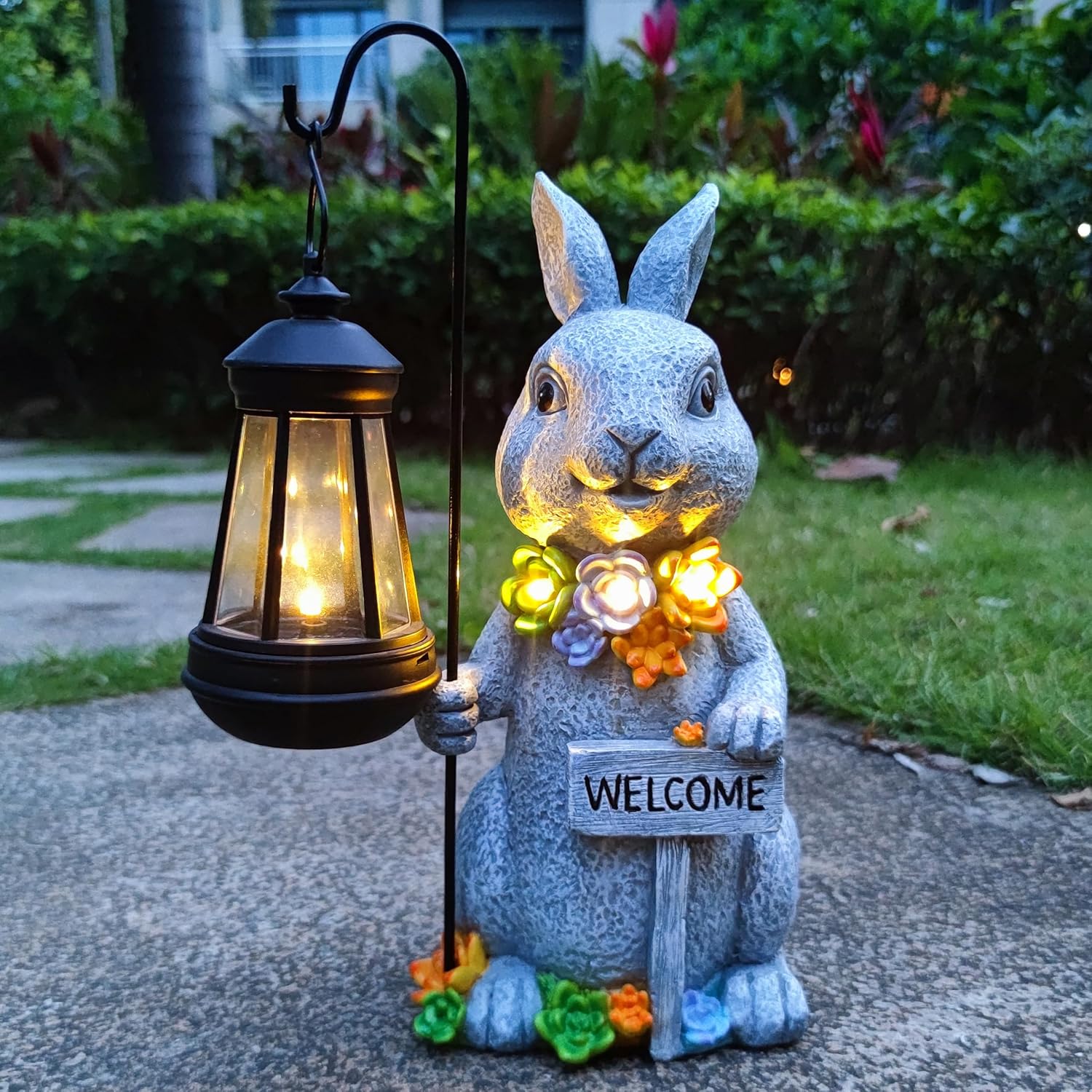 - 【Unique design】The cute and funny rabbit,holding a lantern in his right hand and Welcome card in his left,A special and colorful design of the succulent plant with LED light in it make the solar garden decor more close to nature.The size of this rabbit figurine is 4.9X5.1X10.6inches,the lantern is 5.5X2.75X2.75inches.This rabbit figurines made of resin material, hand-painted and finished with a UV resistant coating can withstand rain, snow or scorching sun without fading .