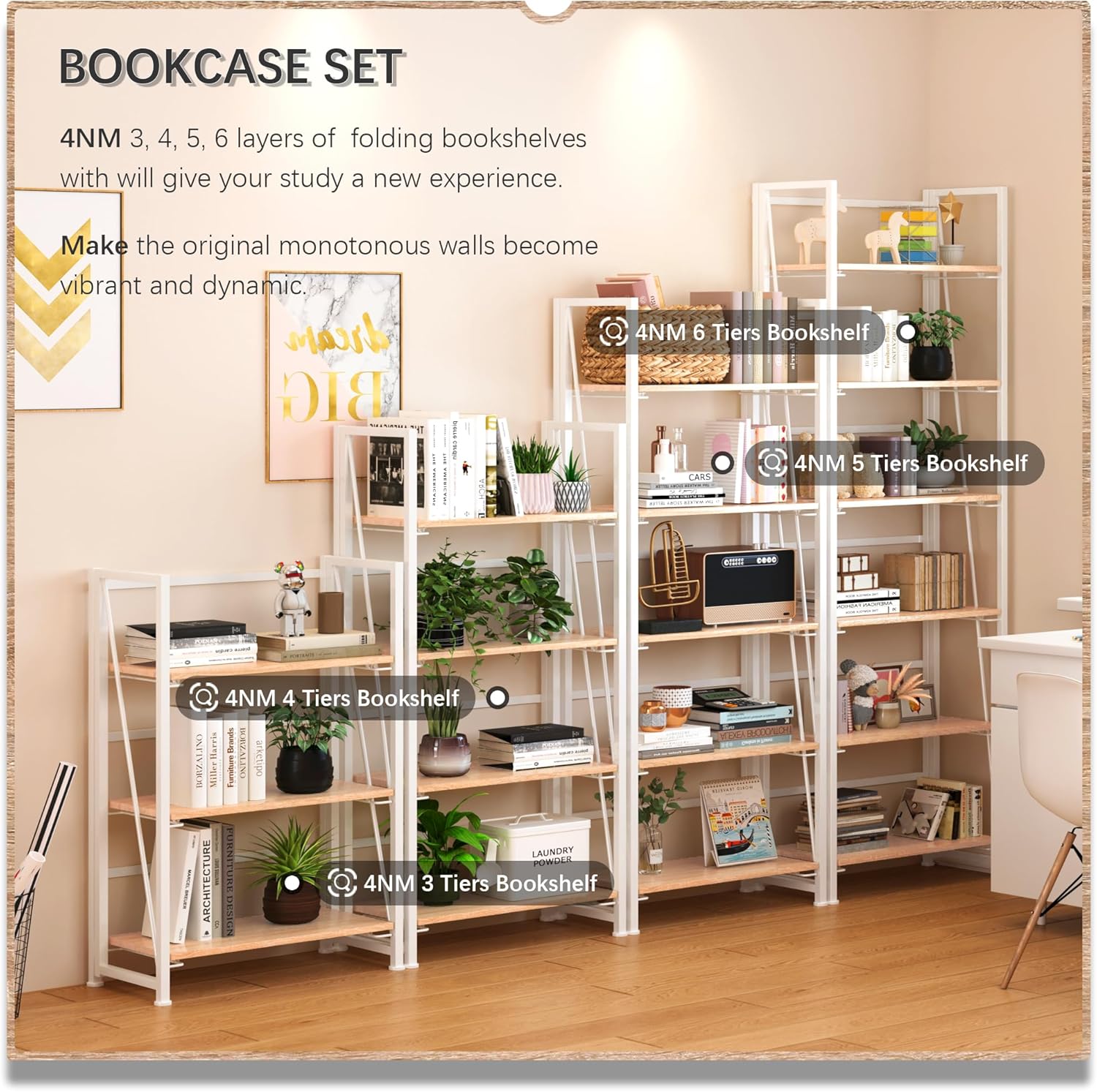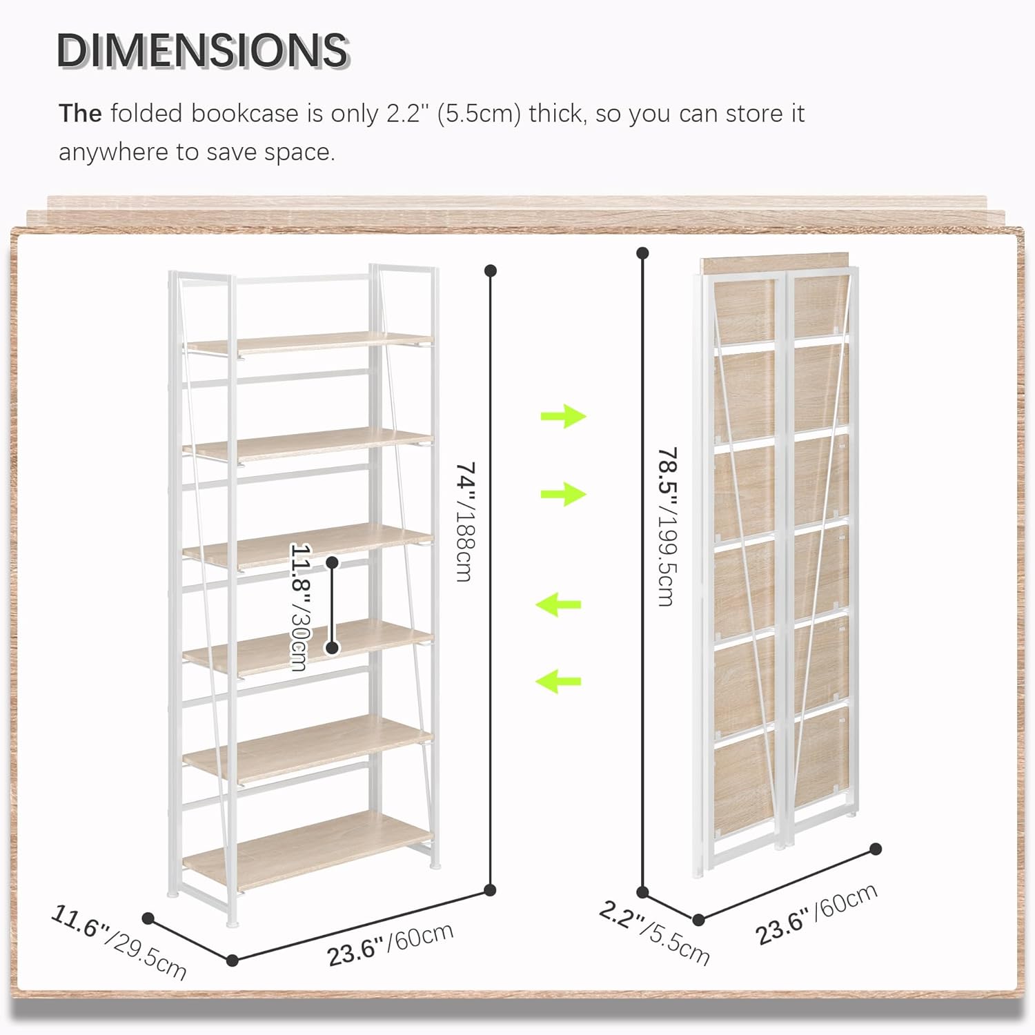 4NM No Assembly Foldable Bookshelf, 6-Shelf Collapsible Bookcase Storage for Small Spaces, 74" H, Natural White