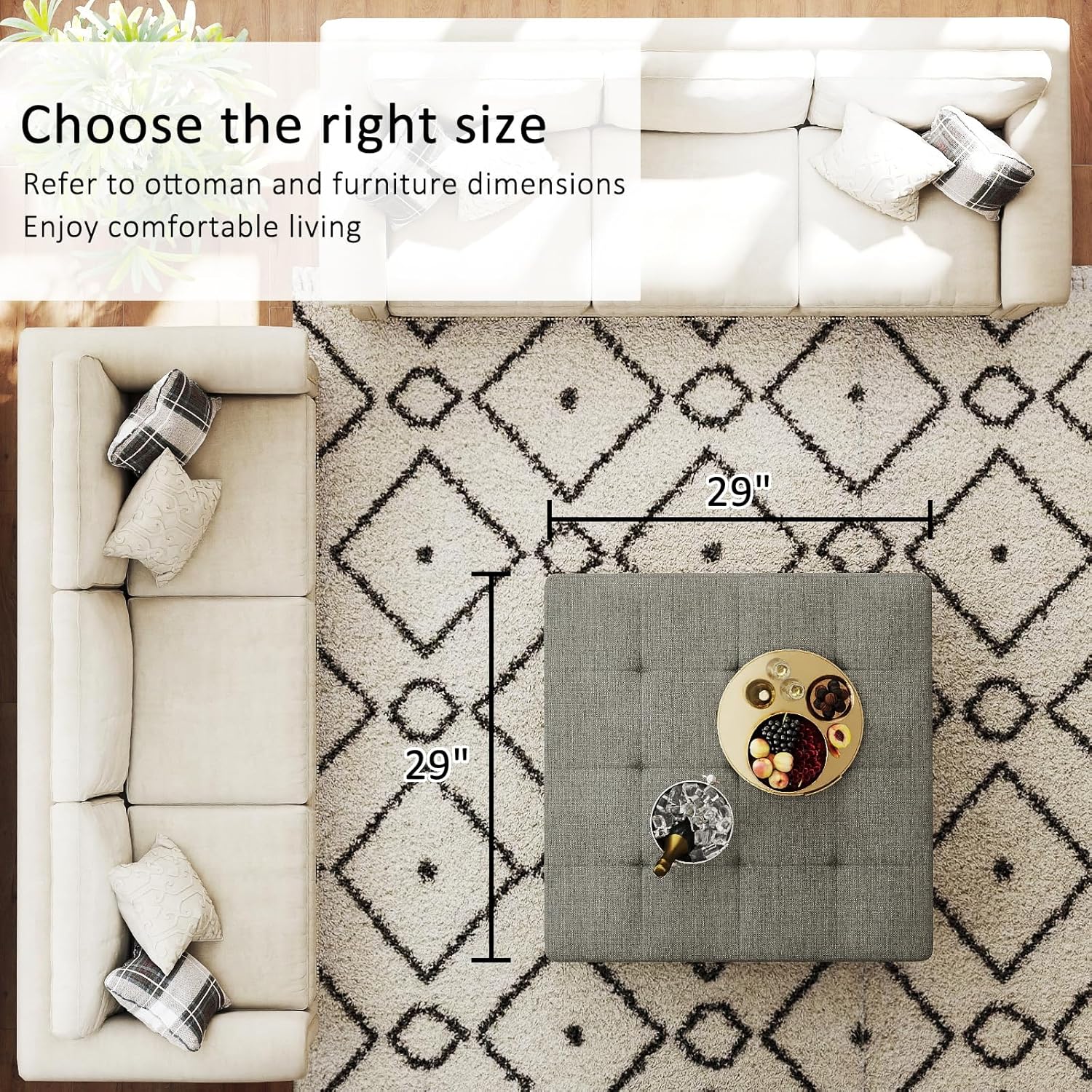 Large Square Ottoman Coffee Table, Linen Solid Upholstered Footrest Ottoman with Solid Wood Shelf Storage Tufted Coffee Table for Bedroom Living Room, Granite