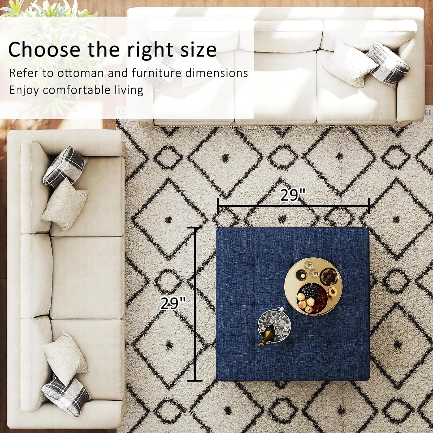 Large Square Ottoman Coffee Table, Linen Solid Upholstered Footrest Ottoman with Solid Wood Shelf Storage Tufted Coffee Table for Bedroom Living Room, Navy Blue