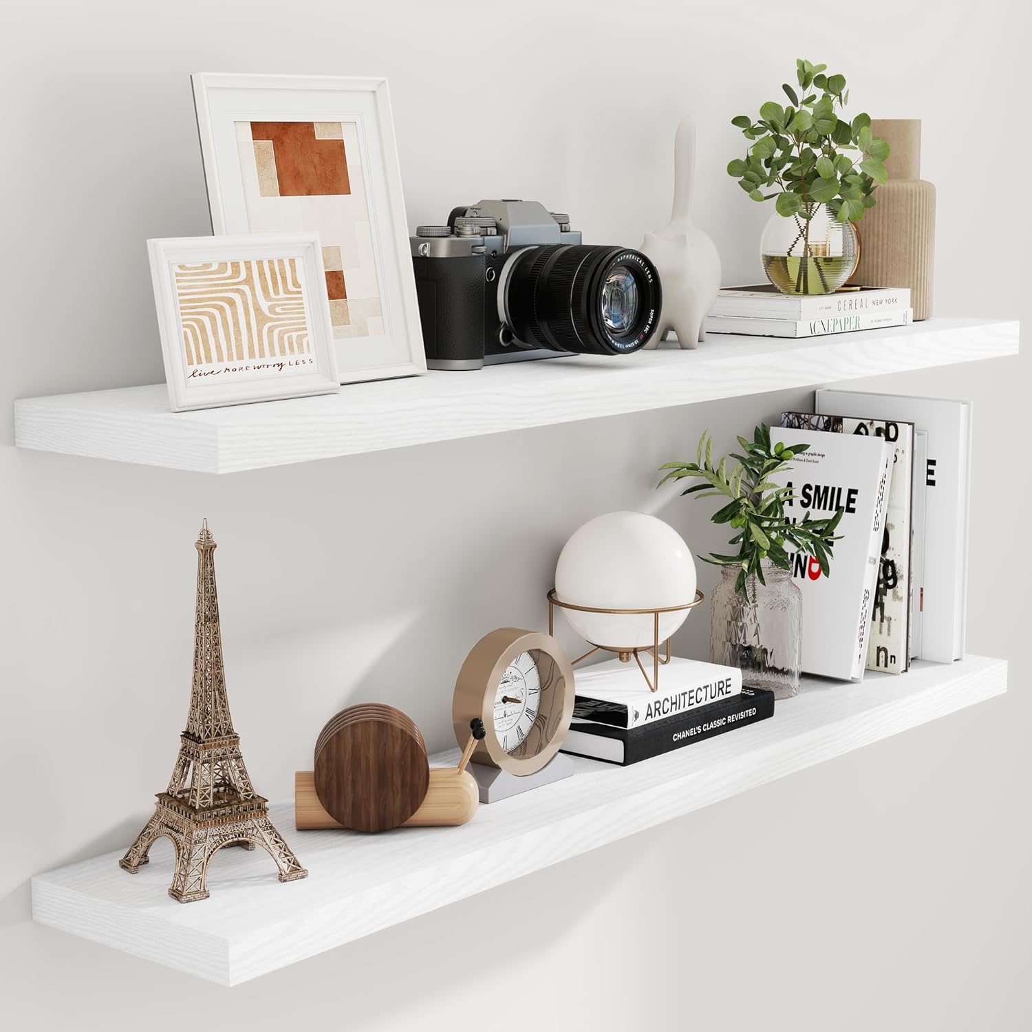 Fun Memories Floating Shelves 55 Inch Set of 2, White 55 x 9 Wall Shelves for Home Decor Storage, Rustic Wood Floating Shelf for Wall, 9 Inch Deep Shelving for Bathroom, Living Room, Kitchen