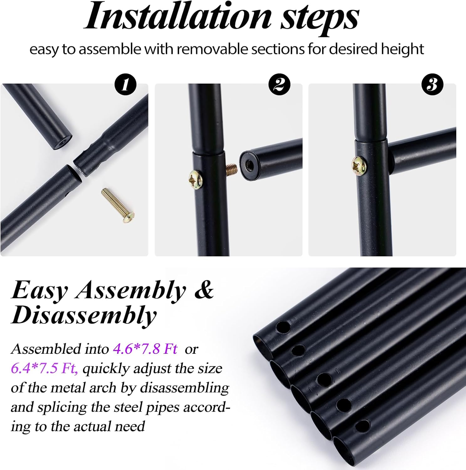 - CONVERTIBLE SIZE: Assembled into 4.6*7.8 Ft or 6.4*7.5 Ft; quickly adjust the size of the metal arch by disassembling and splicing the steel pipes according to the actual need