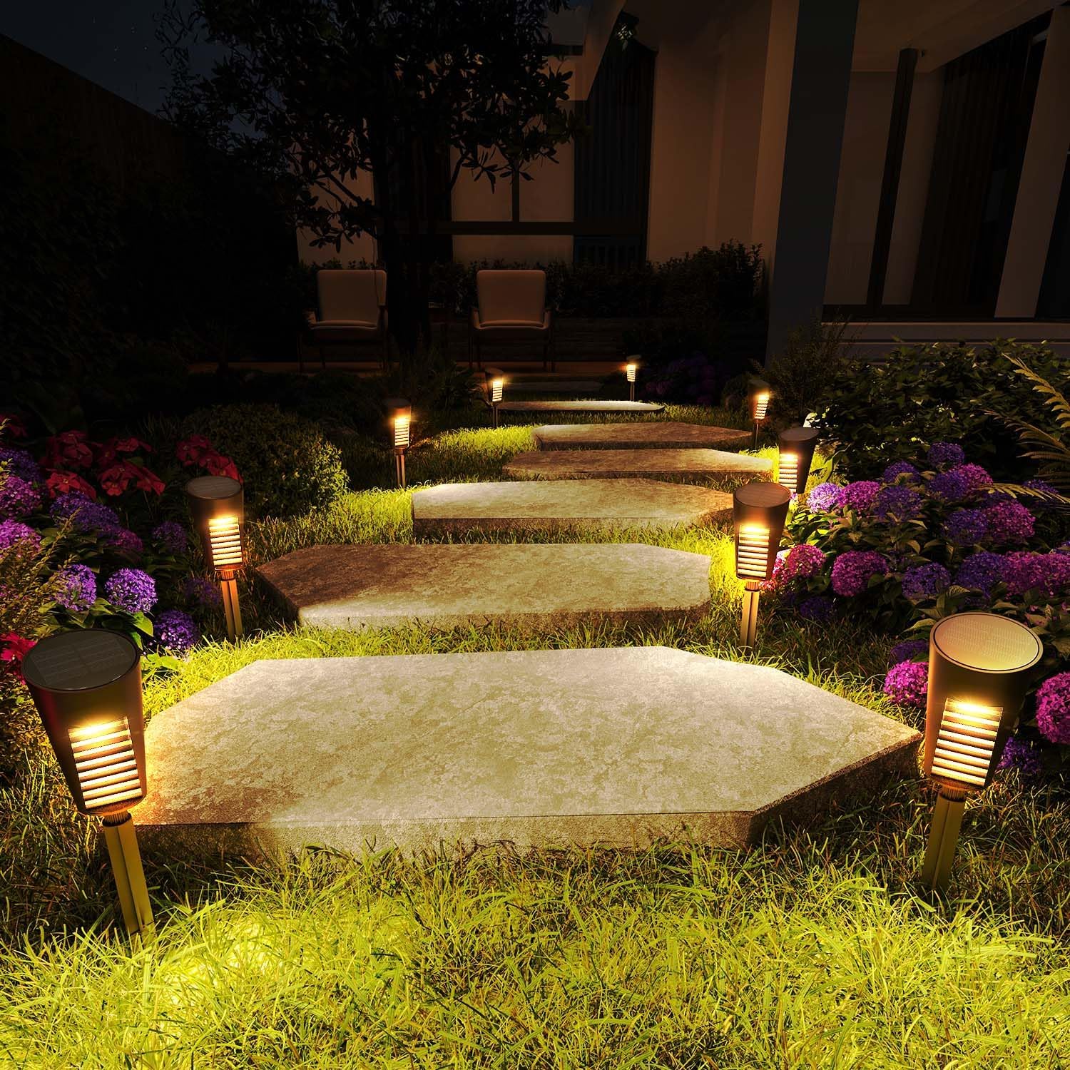 - Automatic ON/OFF & High-Efficiency Charging β Equipped with sensitive dusk-to-dawn sensors, the outdoor solar lights for yard automatically turn on at night and off at dawn. With upgraded solar panels and a high-capacity battery, solar stake lights fully charge in 6β8 hours of sunlight and provide up to 10β12 hours of continuous lighting.