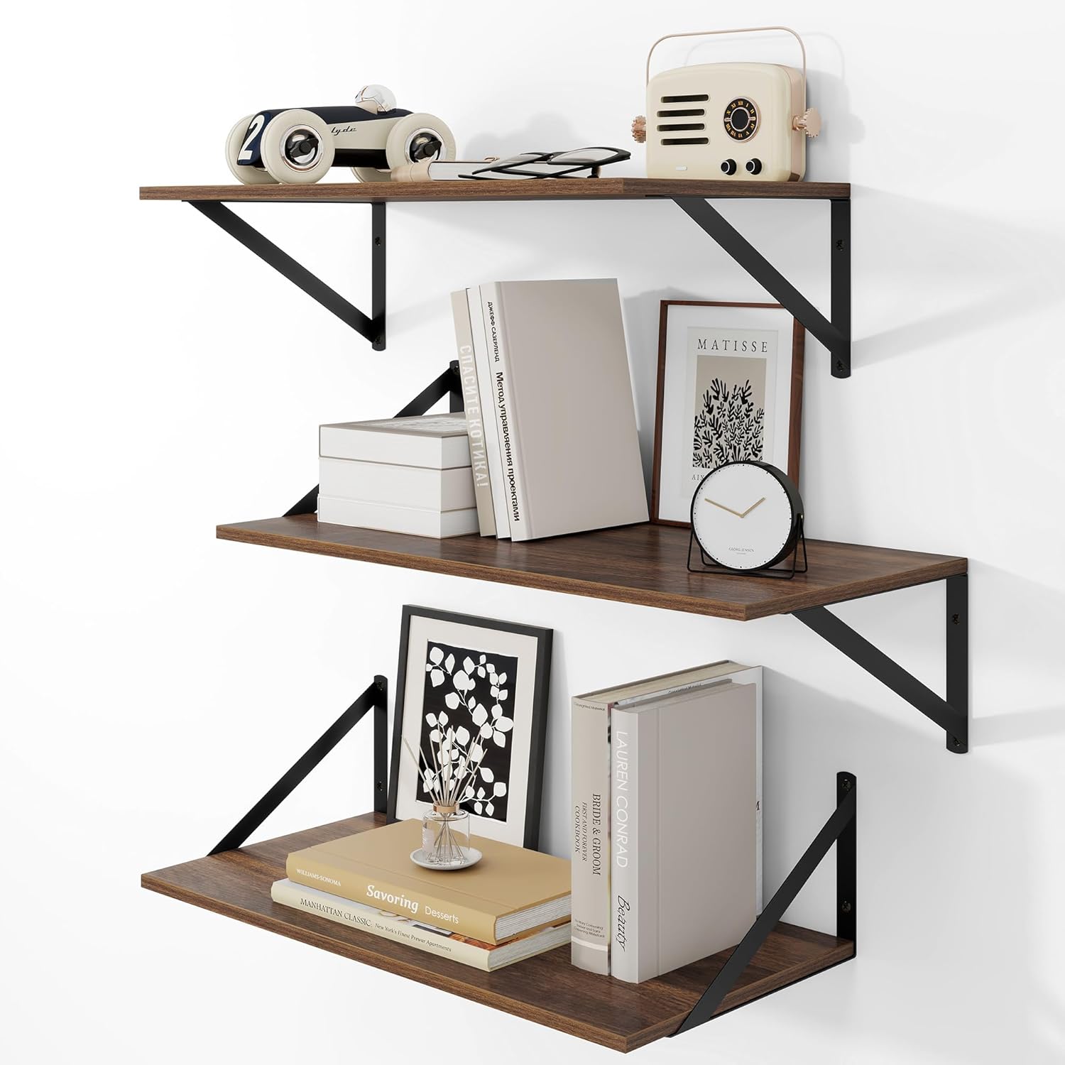 - Effortless 10-Minute Installation: All necessary hardware is included in the package. With pre-drilled mounting holes and detailed step-by-step instructions, these wide floating shelves can be securely installed in just minutes. Package Contents: 3 wooden boards (24" W x 12" D), 6 steel brackets, 13 anchors, 13 long screws, 13 short screws, 1 level, 1 installation manual.