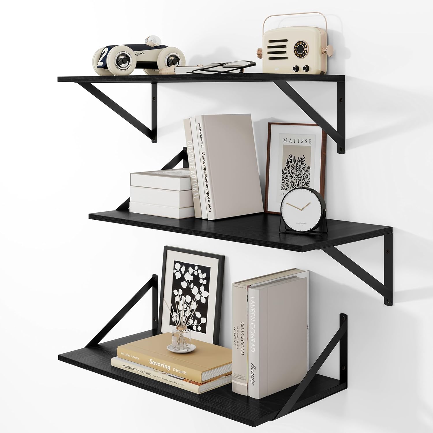 Heimlove 24" W x 12" D Wall Shelves for Books, 12 Inch Deep Floating Shelves Set of 3, Wide Floating Bookshelf with Metal Bracket for Living Room, Kitchen, Office, Bedroom and Decor Storage - Black