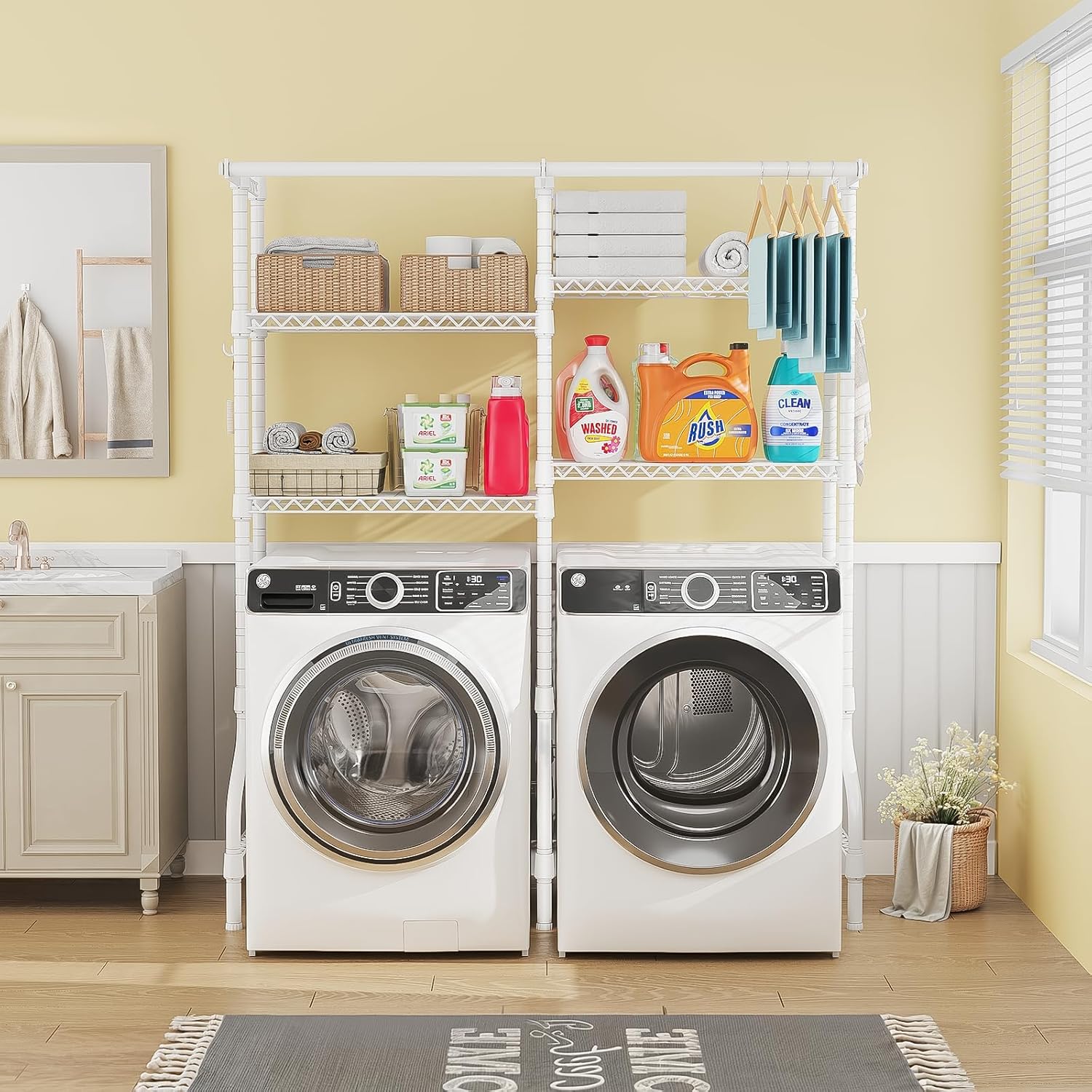 - [Smart Space Optimization]: The 4 pieces of metal shelves can organize and store laundry detergent, washing powder and liquid, and other accessories. The 2 clothes hanger rods allow vertical clothing drying and do not affect storage space