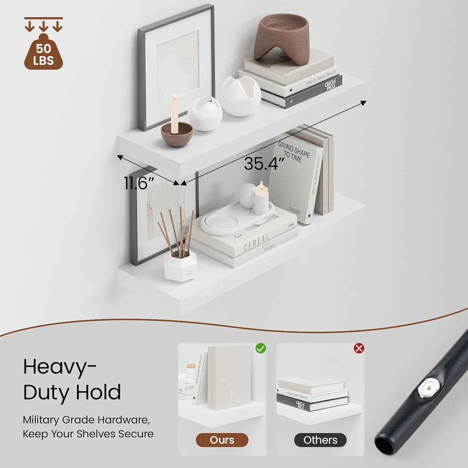 - Enhanced Durability: Heimlove wall shelves are built with military-grade iron hardware and engineered wood. With heavy-duty metal brackets, they provide long-lasting strength and stability for all your items. A high load capacity of up to 25 pounds. The sleek, invisible design adds a touch of elegance to any space.