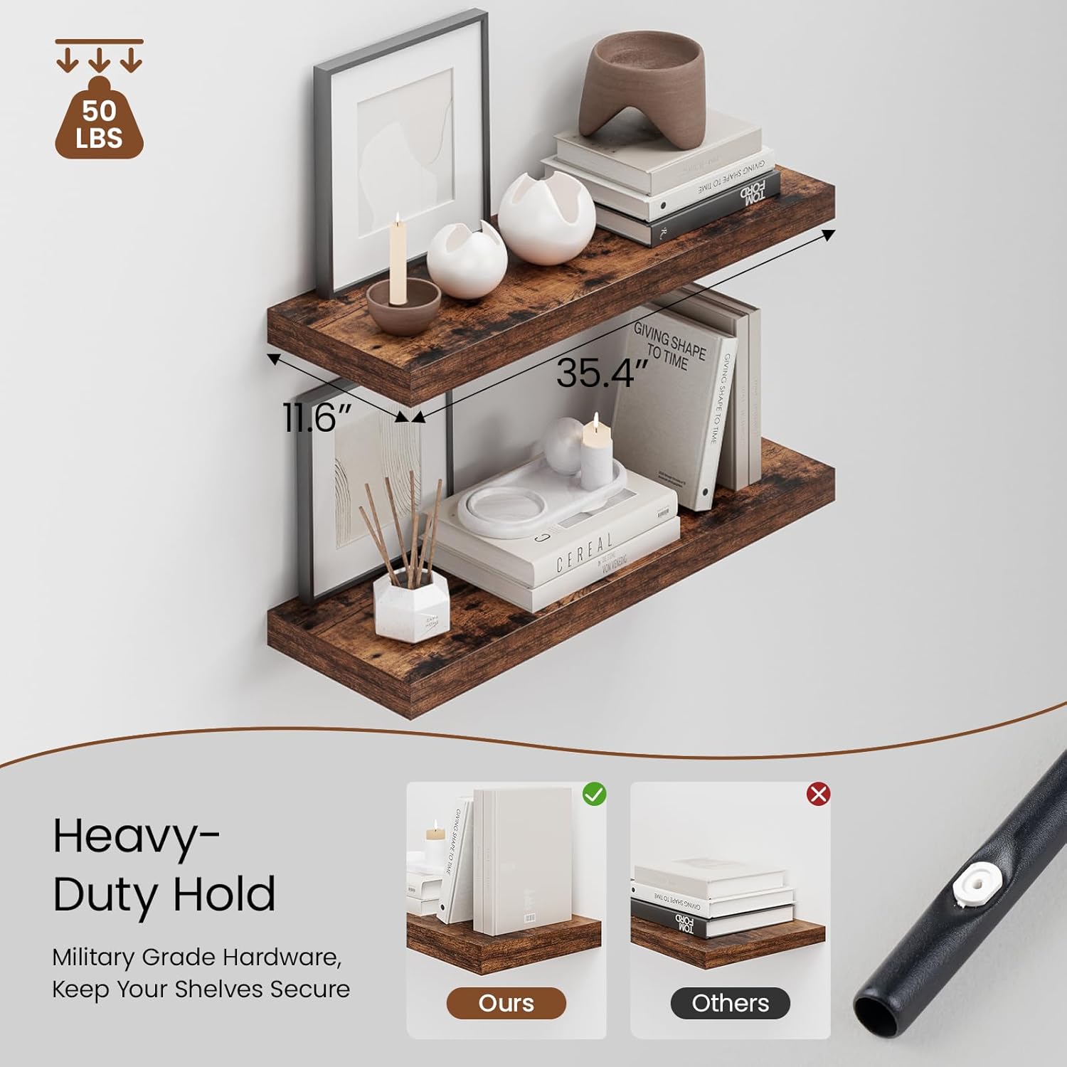 - Enhanced Durability: Heimlove wall shelves are built with military-grade iron hardware and engineered wood. With heavy-duty metal brackets, they provide long-lasting strength and stability for all your items. A high load capacity of up to 25 pounds. The sleek, invisible design adds a touch of elegance to any space.