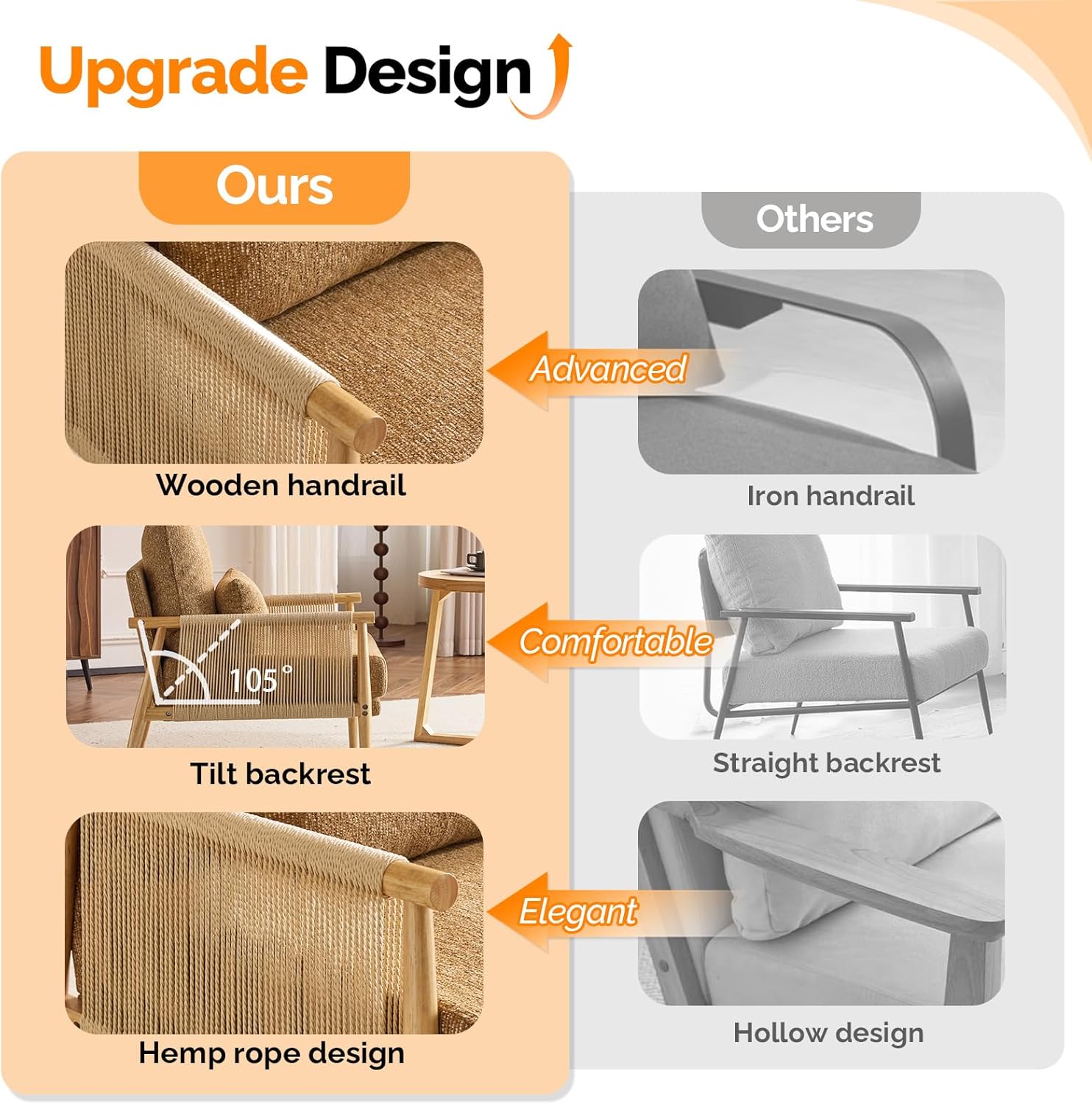 - Braid Design : The Boho-inspired Braid Accent Chair showcases elegant paper cord weaving across its angled armrests. Its thoughtful design combines comfort and style with a medium-height backrest and plush cushioning. This piece seamlessly blends casual and sophisticated interior comfort, perfect for home decoration.The two chairs will be shipped in separate packages. Please note that they may not arrive at the same time.