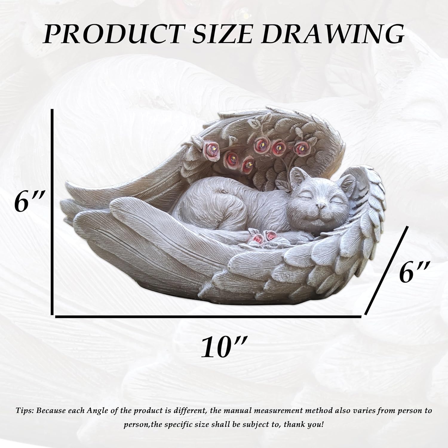 - 【Product Design】Our solar cat memorial a peaceful sleeping cat figurine with feathered and flowered angel wings, creating a beautiful and meaningful way to honor and remember beloved pets. The cat measures 10X6.3X6 inches,Our pet memorial stones a thoughtful and heartwarming way to honor the life and memory of your furry friend.Made from resin