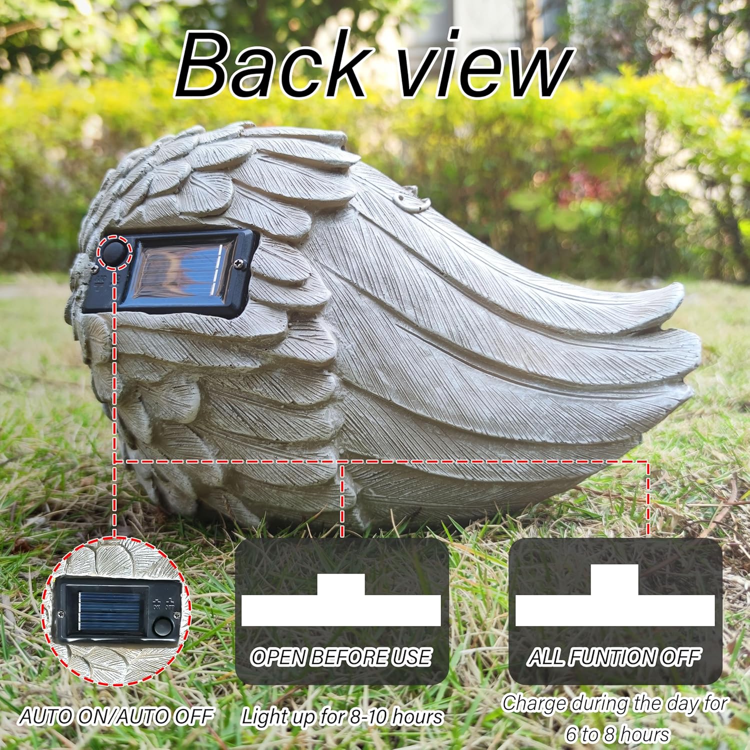 - This Angel cat statue decoration is equipped with a solar panel on the back of the angel cat statue. Turn the switch to the "ON" position before first use and keep charging for 6-8 hours the sun.Open the button to charge during the day, and you can open the button to use at night. This pet memorial stone can be placed in any outdoor setting without worrying about damage from the elements.