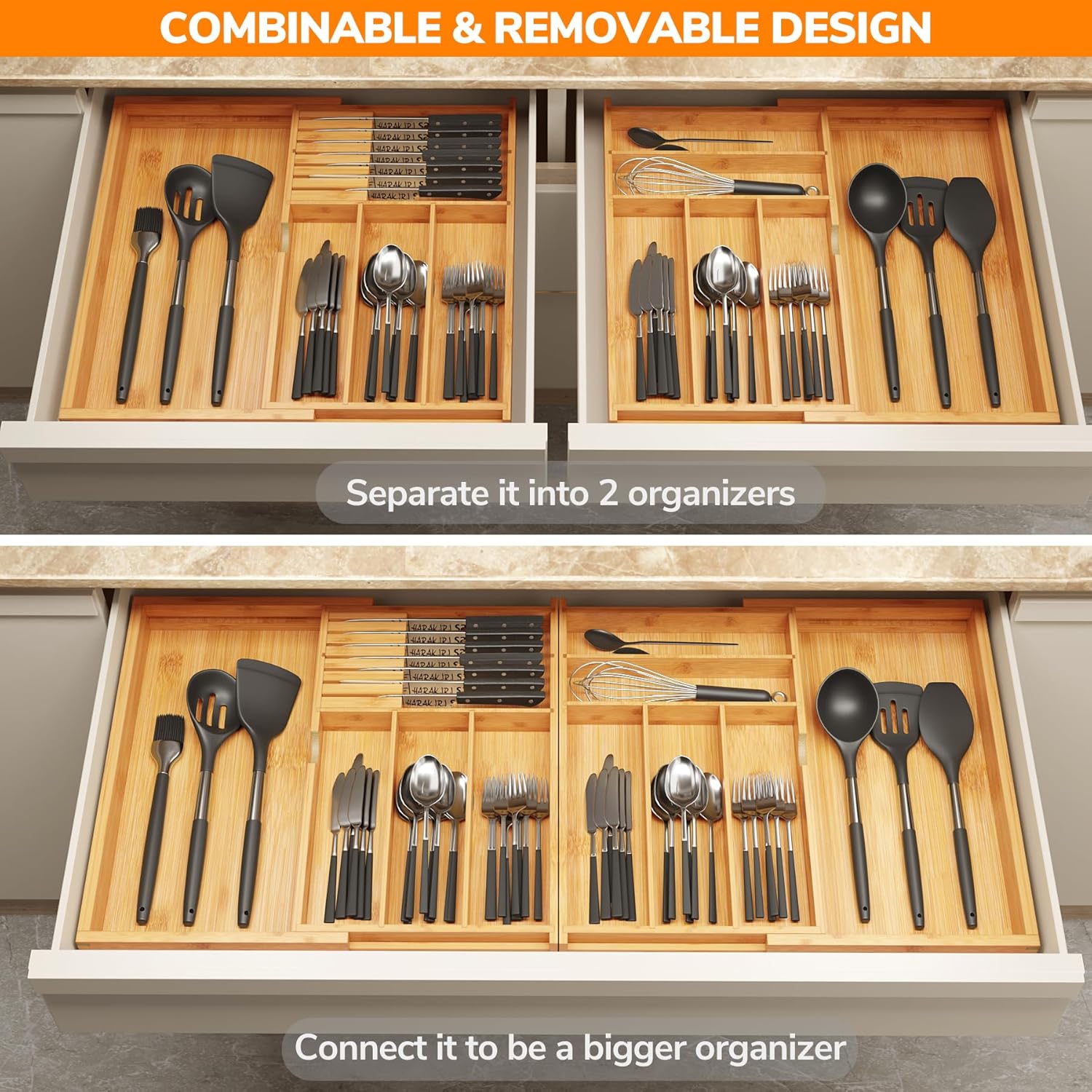 - Flexible & Expandable Design: Flexibility to combine or use individually as needed to accommodate a variety of drawer sizes. Combined use expand from 21.3" to 36" for extra-large storage space. Different sized compartments can accommodate utensils of all dimensions, making it a versatile addition to your kitchen storage solutions. The bamboo's durability and stability ensure that the expandable design won't affect its stability, providing a smooth pull every time.