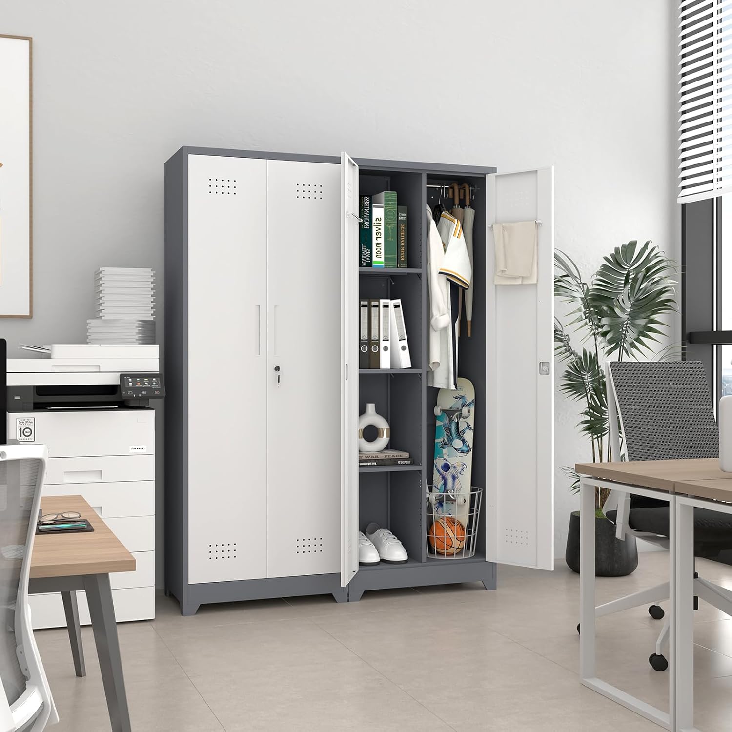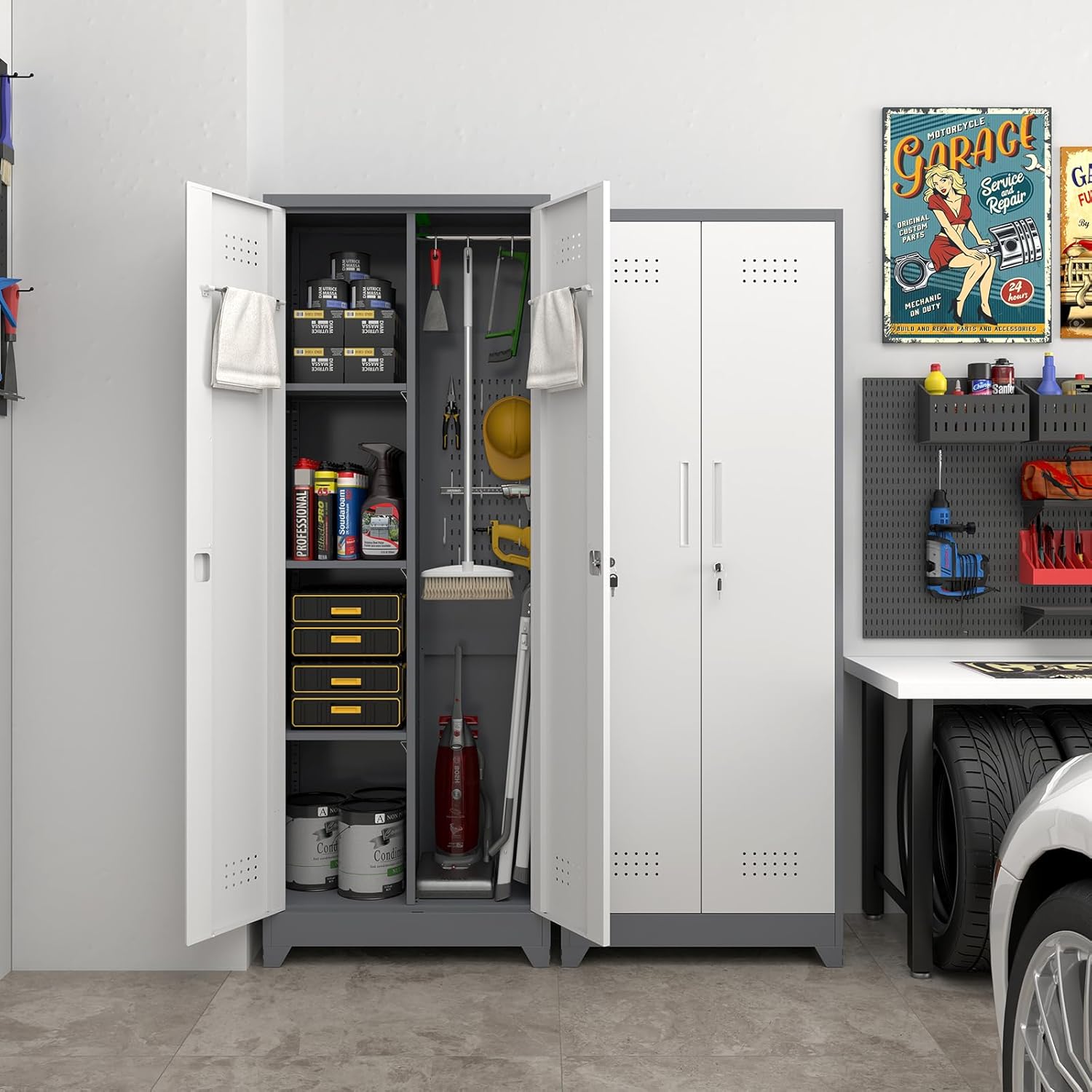 Locking Cabinet,Metal Storage Cabinet with Doors and Shelves,Broom Closet Storage Cabinets for Bedroom,Home Office,Grey-White