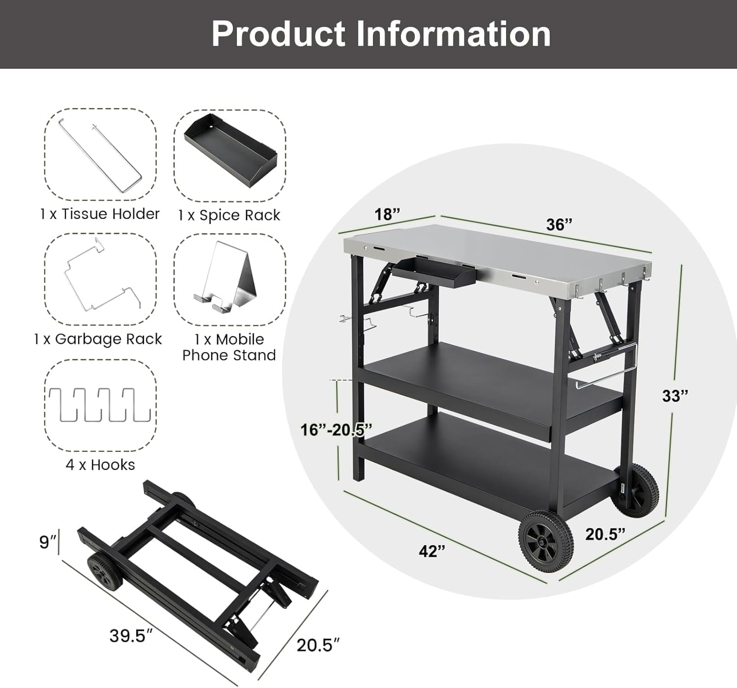 - 【Food-Safe Prep Surface】: 201 stainless steel tabletop (18"x 36"), weight capacity of tabletop: 110 lbs.