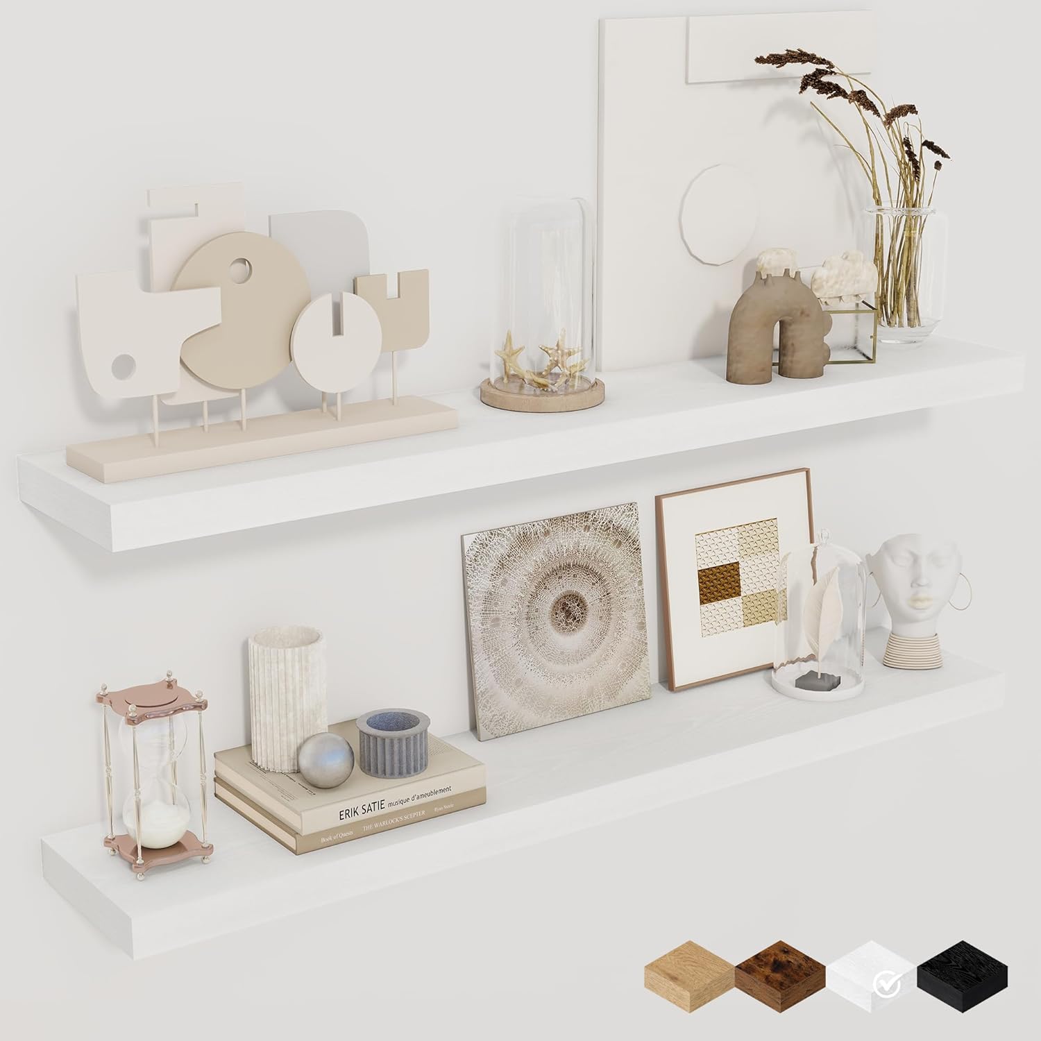 Fun Memories 36Inch Floating Shelves for Wall 2 Pack Wood Shelves for Kitchen, Bathroom, Bedroom Wall Mounted Rustic Wood Floating Shelf with Invisible Brackets for Books, Storage, Decor, White