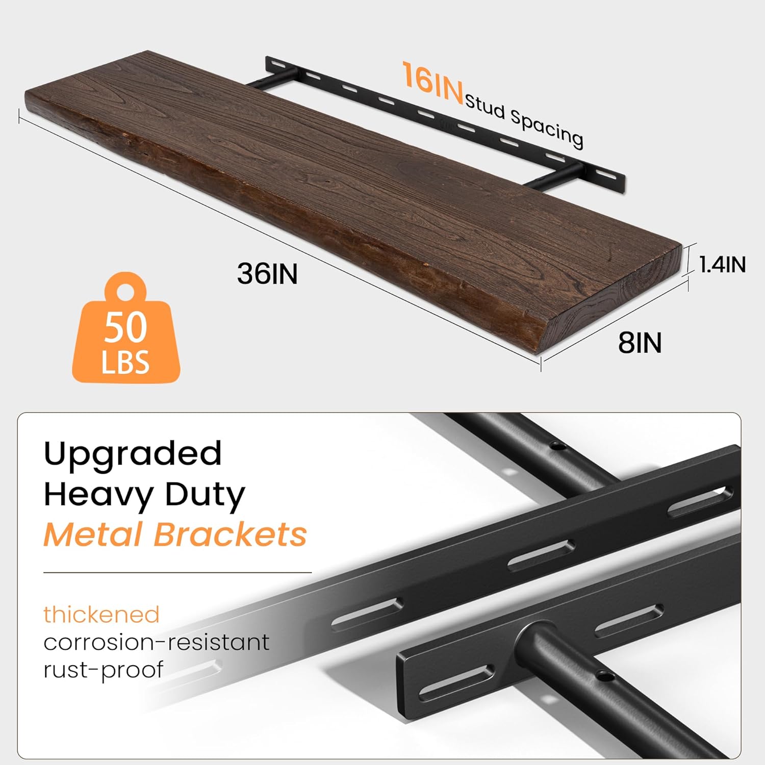 Fun Memories Solid Elm Wood Floating Shelves, 36 Inch Floating Shelves for Wall, Wall-Mounted Live Edge Wooden Shelves with Invisible Heavy-Duty Brackets for Books, Bathroom, Kitchen, Walnut Finish