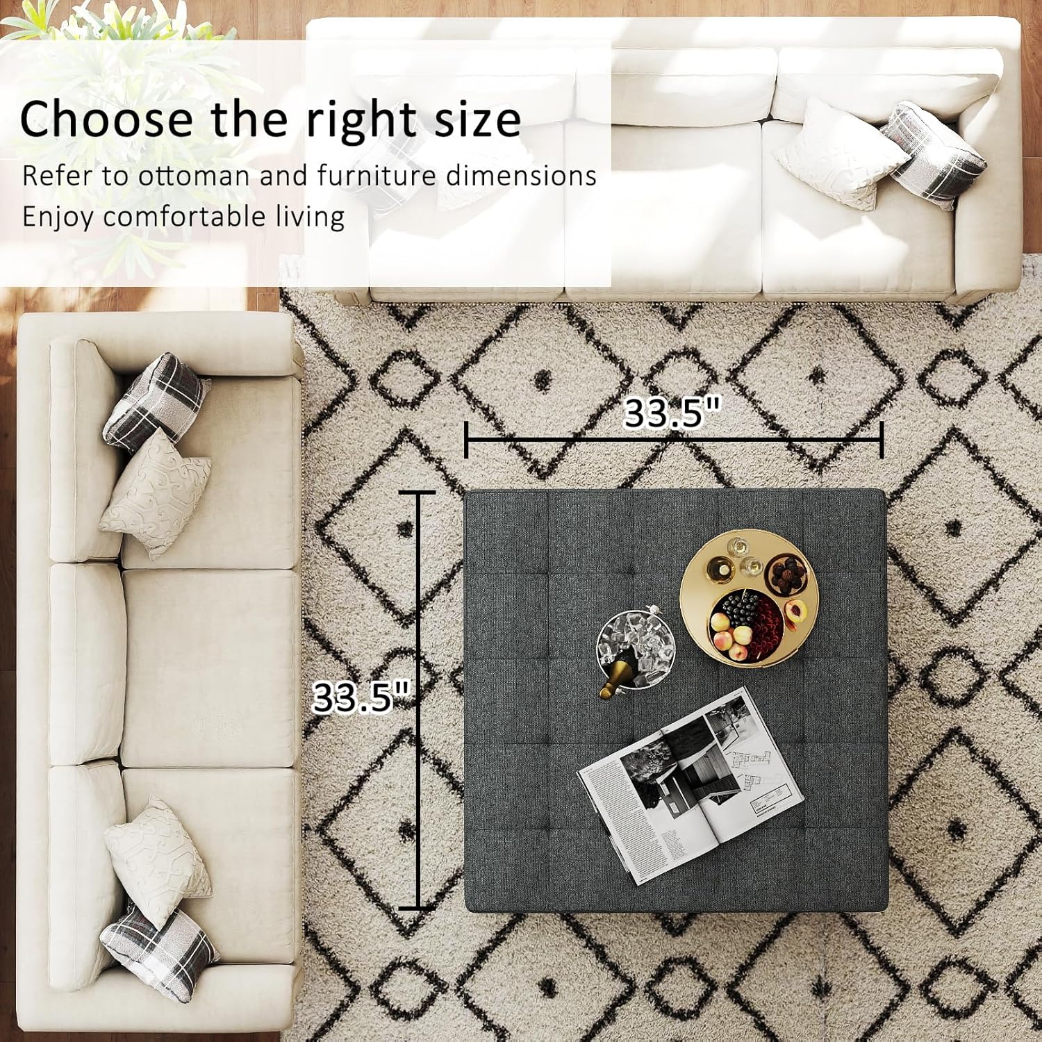 Large Square Ottoman Coffee Table, Linen Solid Upholstered Footrest Ottoman with Solid Wood Shelf Storage Tufted Coffee Table for Bedroom Living Room, Dark Gray