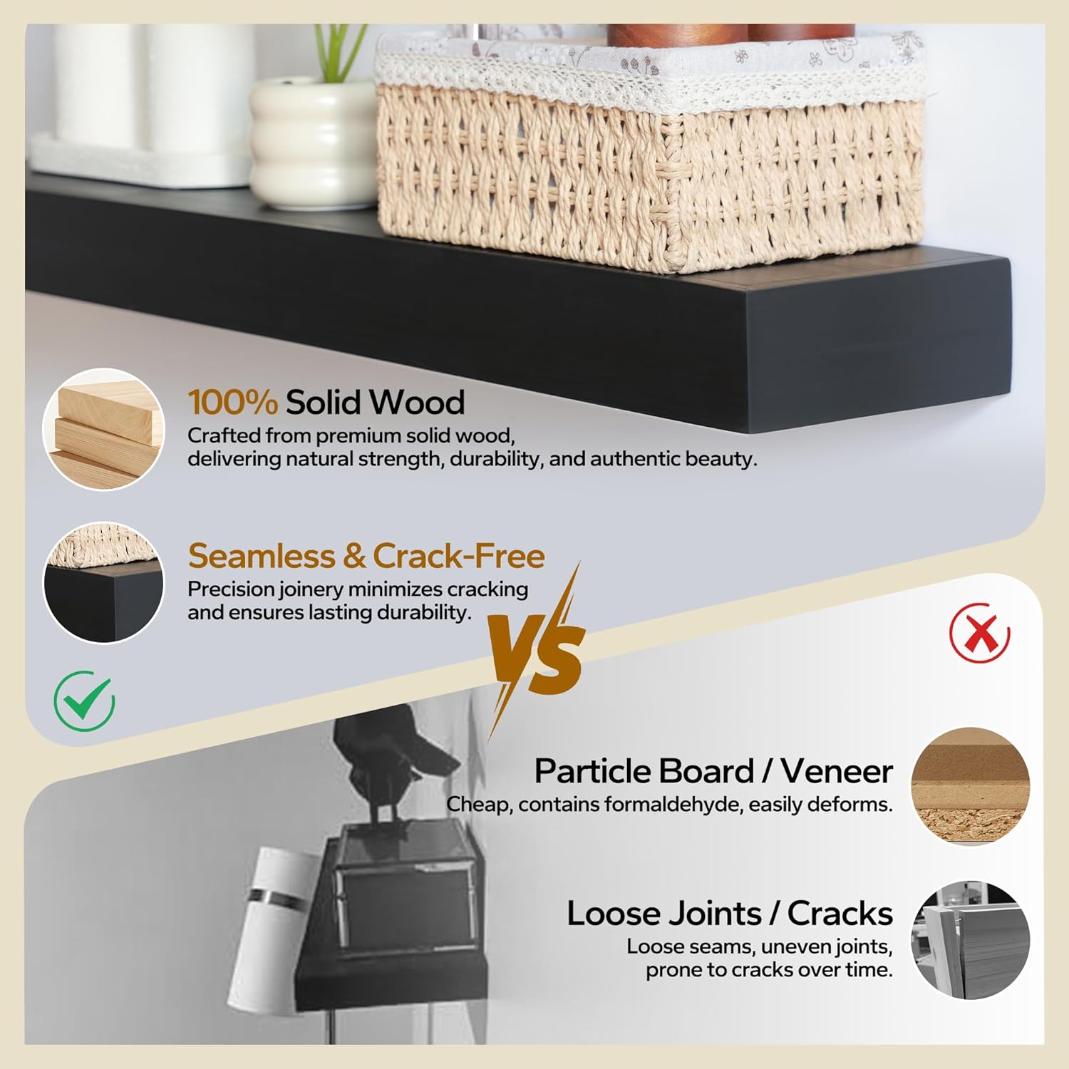 - Premium Handcrafted Solid Wood Shelves: Our floating shelves are made from 100% real solid pine wood, handcrafted to showcase the natural grain and unique knots of the wood. The rustic stain adds a timeless farmhouse charm, enhancing any home decor.