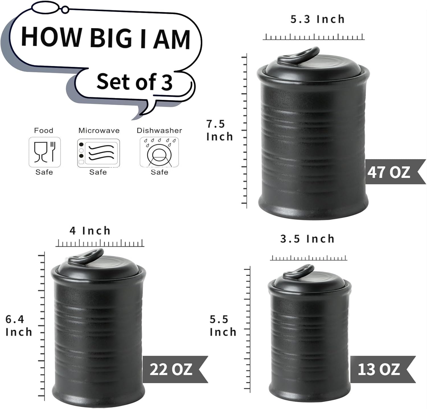 Nihow Food Storage Jar Sets: Ceramic Container with Air Tight Lid for Flour/Sugar/Rice/Coffee/Cookies/Candy - Seal Damp-proof Canister for The Kitchen - Set of 3 (Matte Black)