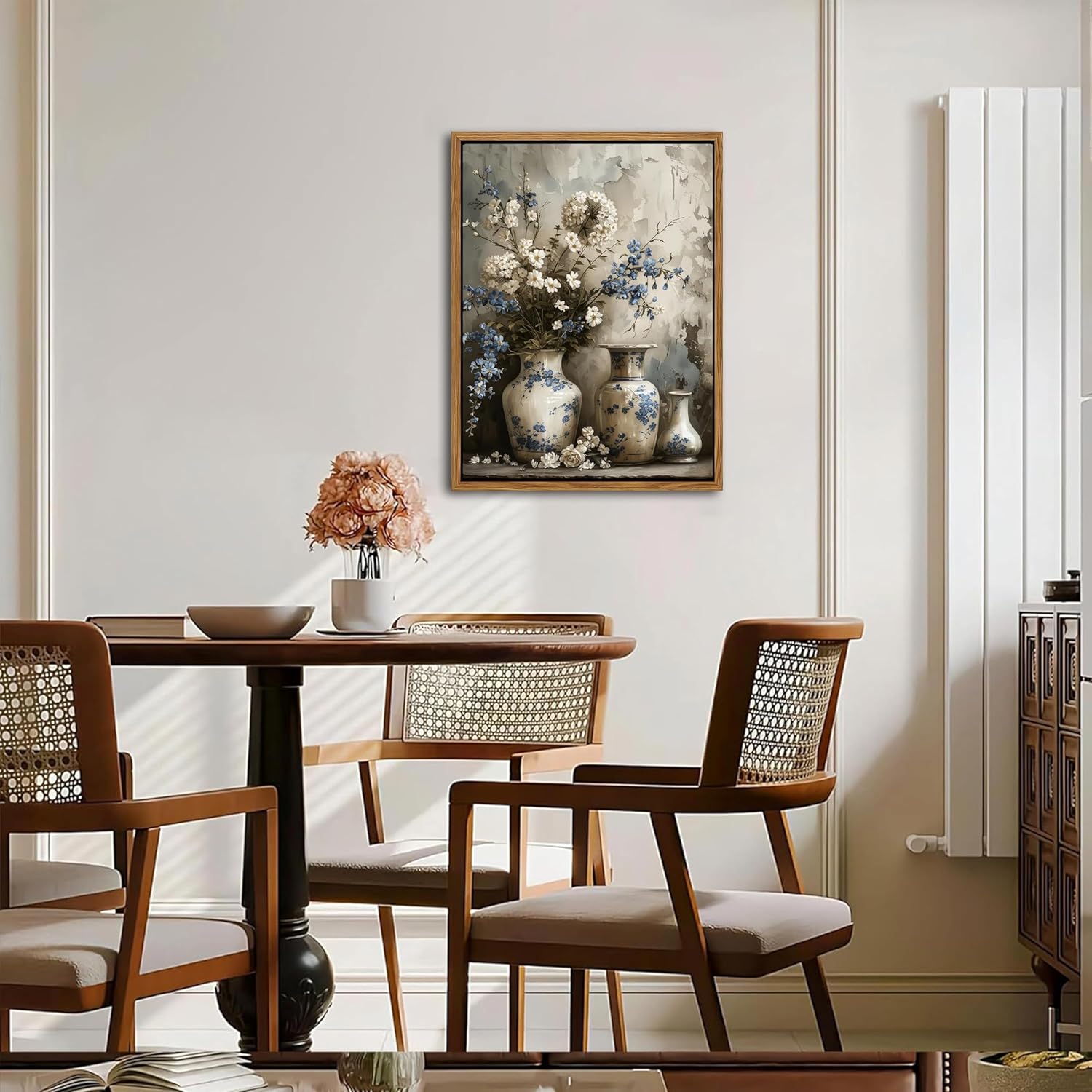- Framed Canvas Wall Art: This vintage farmhouse floral canvas features elegant blue and white flowers in a charming art jar, capturing a timeless rustic beauty. It’s the perfect accent to enhance your living room, bedroom, bathroom, or any cozy home corner.