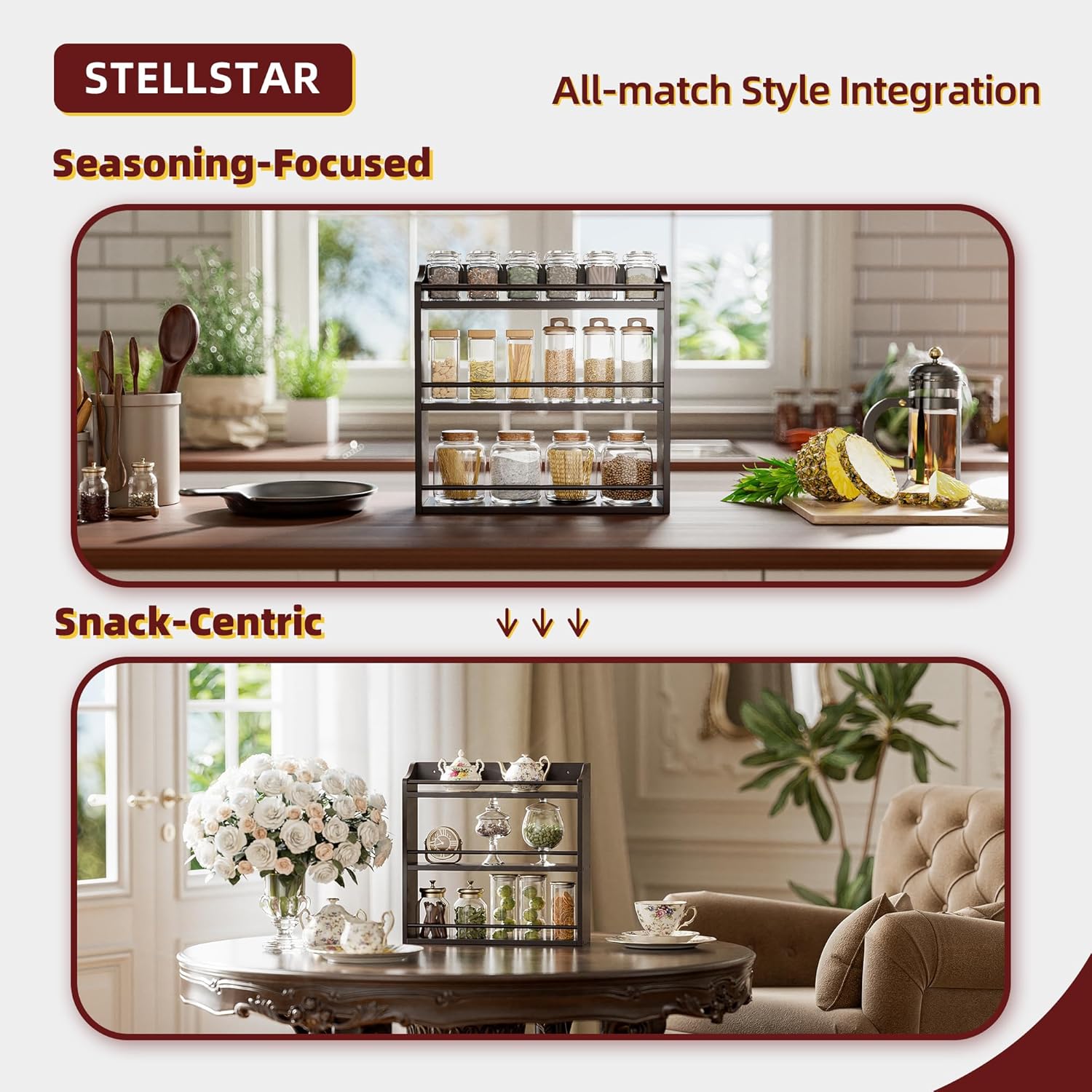 - FIX THE SPICE MESS: Tired of spice clutter? Our 3-tier bamboo rack solves it. Sized 15.83"W x 4.96"D x 15.75"H (5.9" per tier), it saves counter space while triples storage. With 4.96" depth, it fits spices to cans. Each shelf holds 8+ jars; the top tier is for tall bottles. Front guardrails keep jars safe. Get an organized kitchen with this handy rack