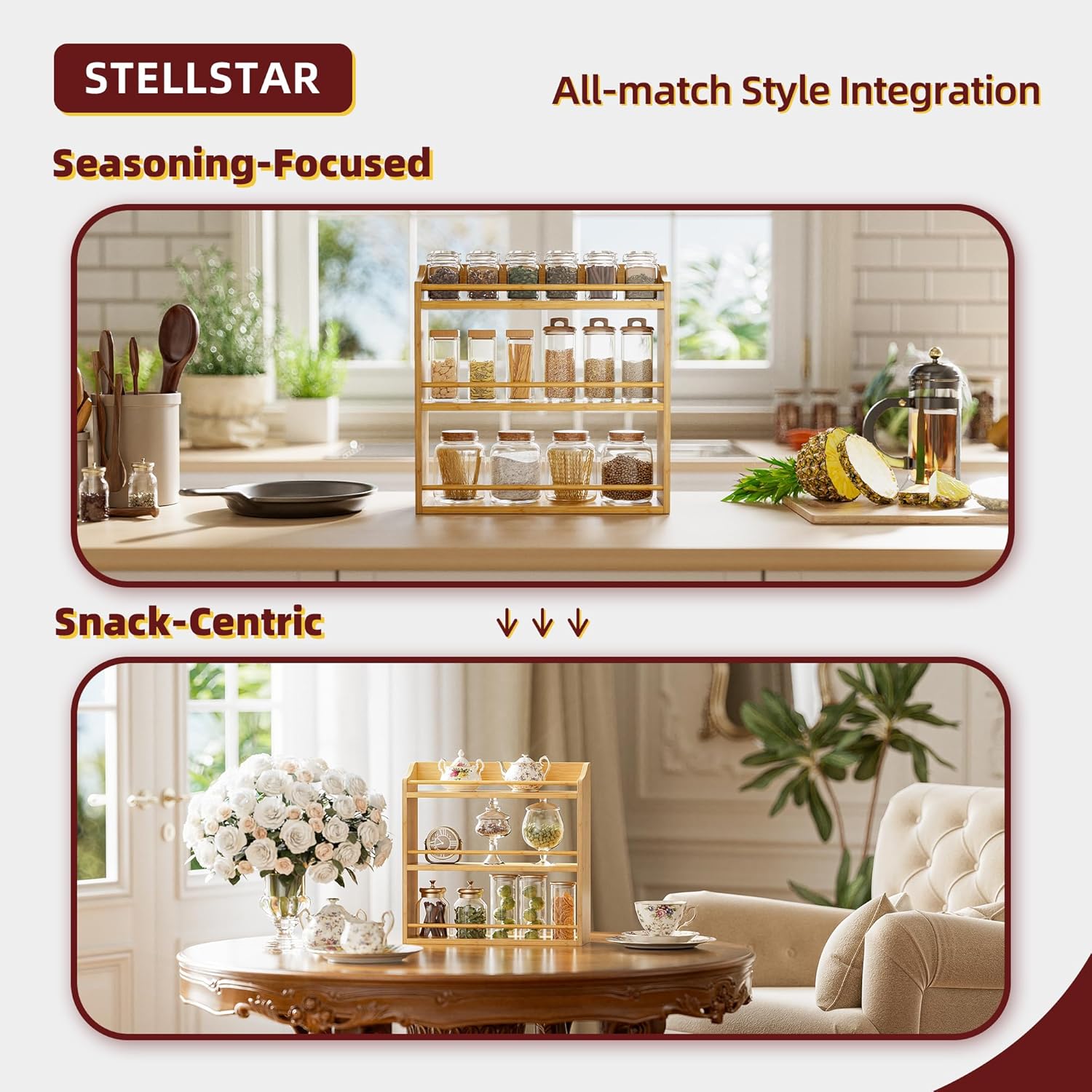 - FIX THE SPICE MESS: Tired of spice clutter? Our 3-tier bamboo rack solves it. Sized 15.83"W x 4.96"D x 15.75"H (5.9" per tier), it saves counter space while triples storage. With 4.96" depth, it fits spices to cans. Each shelf holds 8+ jars; the top tier is for tall bottles. Front guardrails keep jars safe. Get an organized kitchen with this handy rack