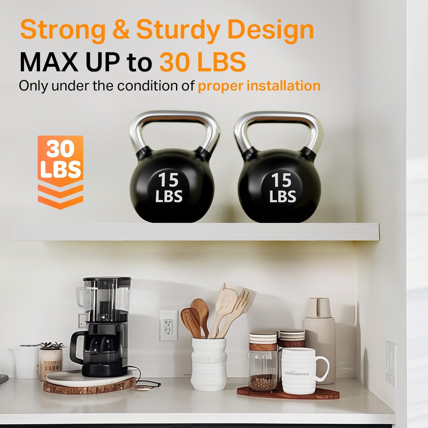 - 𝐒𝐭𝐫𝐨𝐧𝐠 𝐋𝐨𝐚𝐝 𝐂𝐚𝐩𝐚𝐜𝐢𝐭𝐲 – Made from 𝐝𝐮𝐫𝐚𝐛𝐥𝐞 𝐞𝐧𝐠𝐢𝐧𝐞𝐞𝐫𝐞𝐝 𝐰𝐨𝐨𝐝 and reinforced with sturdy brackets, each shelf 𝐬𝐮𝐩𝐩𝐨𝐫𝐭𝐬 𝐮𝐩 𝐭𝐨 𝟑𝟎 𝐥𝐛𝐬, making them ideal for books, plants, toiletries, or decor
