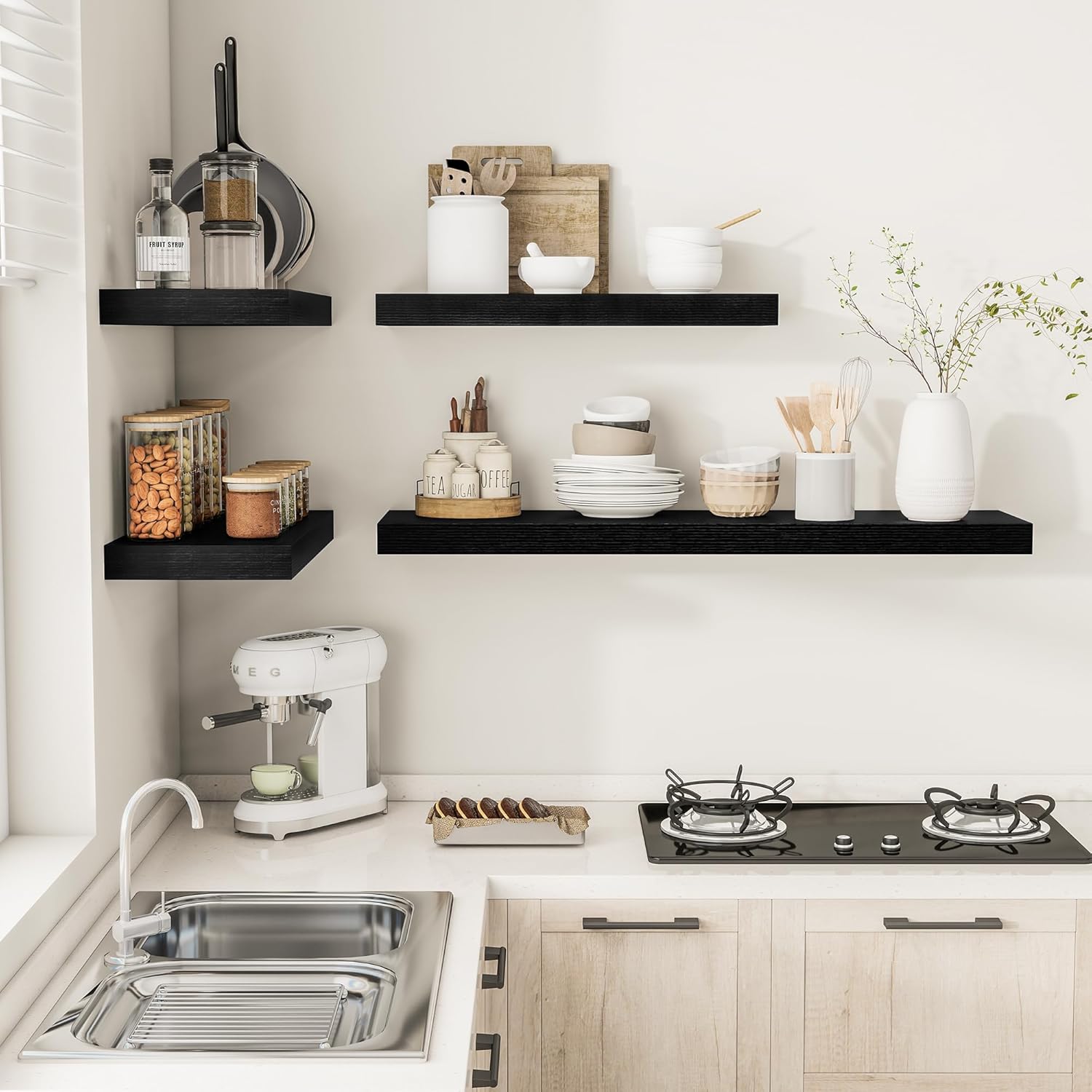 - Well-designed Floating Shelves - The rustic style floating shelves combining both practicality and style. These shelves offer a 12" generous deeper and thicker surface, perfect for organizing daily sundries without taking up valuable floor space.