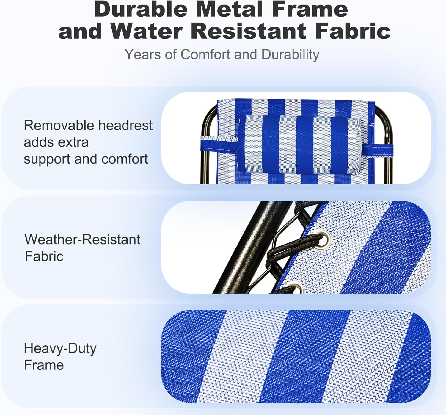 - PORTABLE DESIGN: Lightweight and foldable, our Lounge Chairs are easy to take with you on the go, whether you're heading to the beach, park, or your child's next sporting event.