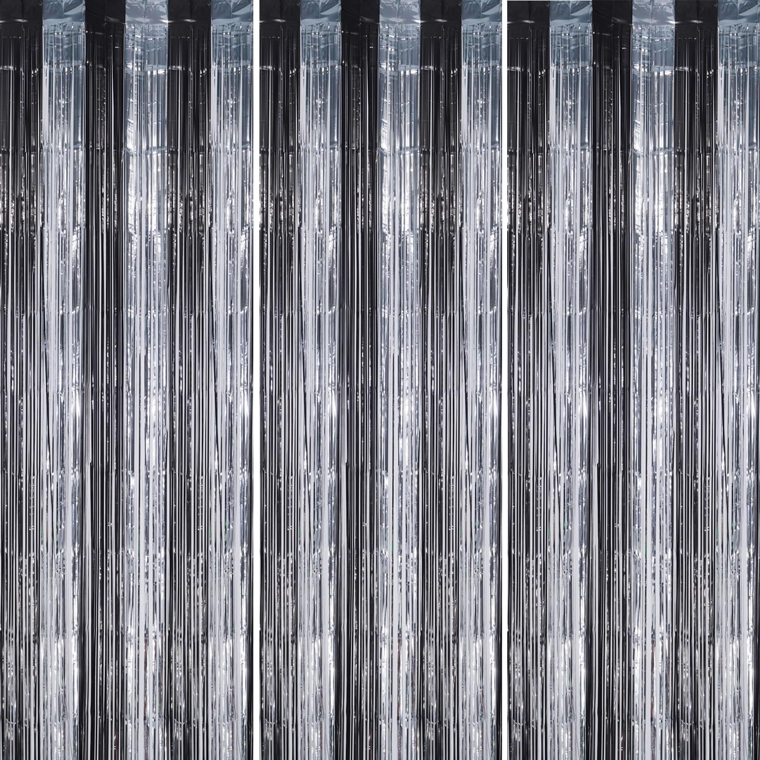 3 Pack Foil Fringe Backdrop - Black&Silver Shiny Tinsel Curtains for Party Decoration/Photo Booth Props - 3.3x8.2 FT Metallic Foil Backdrop for Birthday, Wedding, Graduation, Christmas.