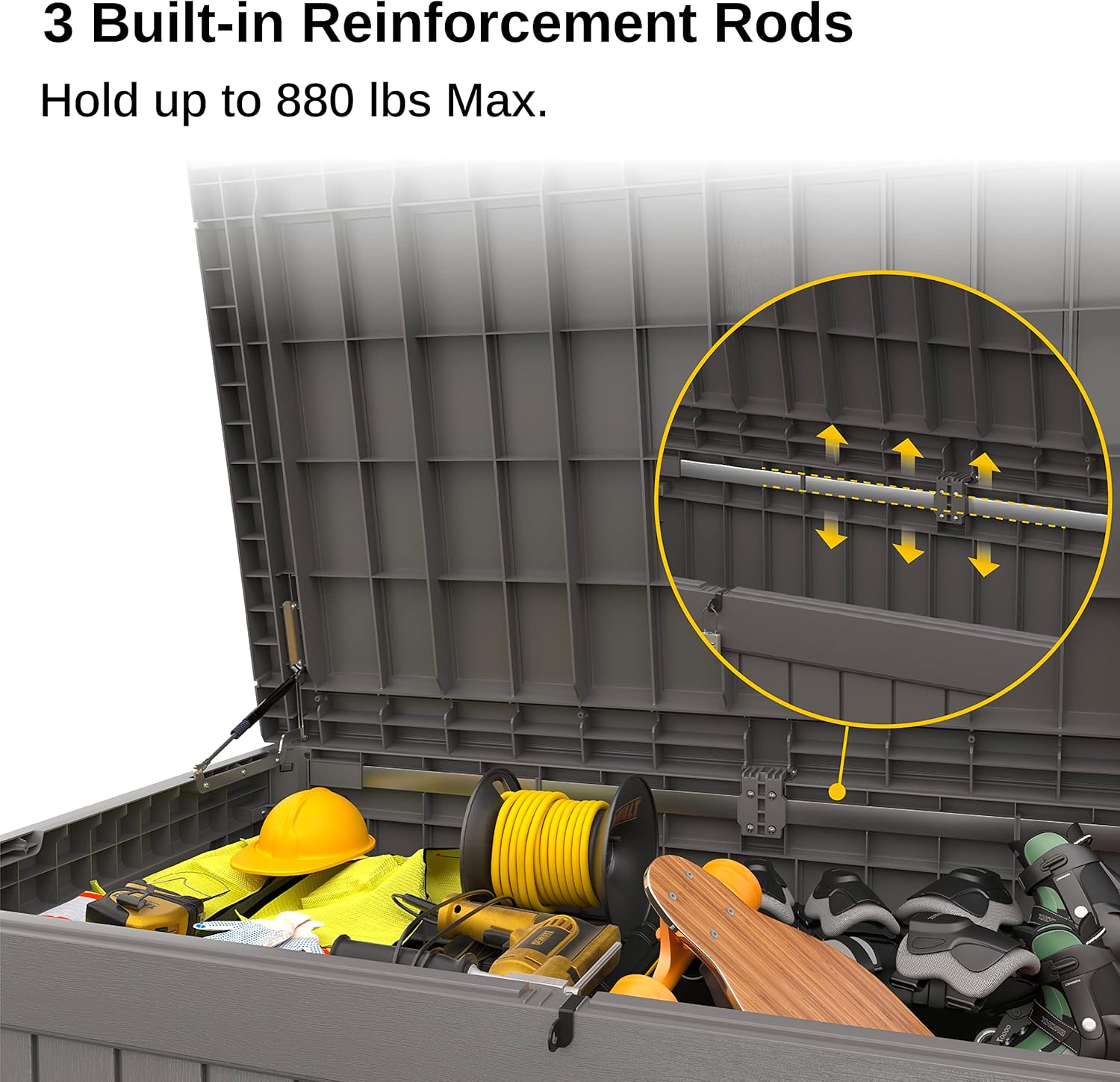 - ๐ฆ๐ง๐ฅ๐ข๐ก๐ ๐๐ก๐ ๐ฉ๐๐ฅ๐ฆ๐๐ง๐๐๐: The EAST OAK 230-gallon deck box is reinforced with three built-in rods, supporting up to 880 pounds. This makes it perfect for outdoor storage and doubles as a sturdy patio table.