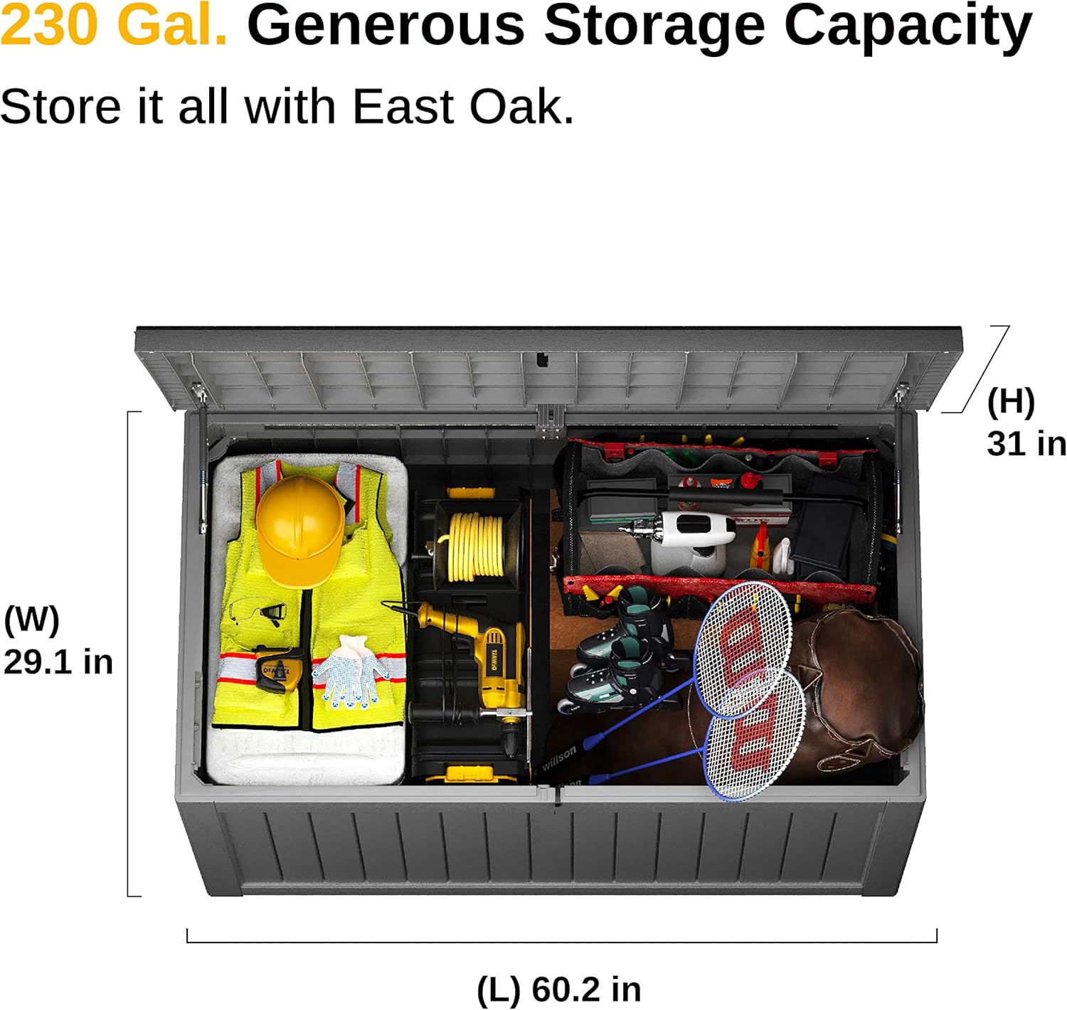 - ๐ฎ๐ฏ๐ฌ-๐๐๐๐๐ข๐ก ๐ฆ๐ฃ๐๐๐๐ข๐จ๐ฆ ๐ฆ๐ง๐ข๐ฅ๐๐๐: The EAST OAK outdoor storage box, measuring 57.5"L x 32"W x 33.5"H, offers ample space for pillows, pool supplies, and other essentials.