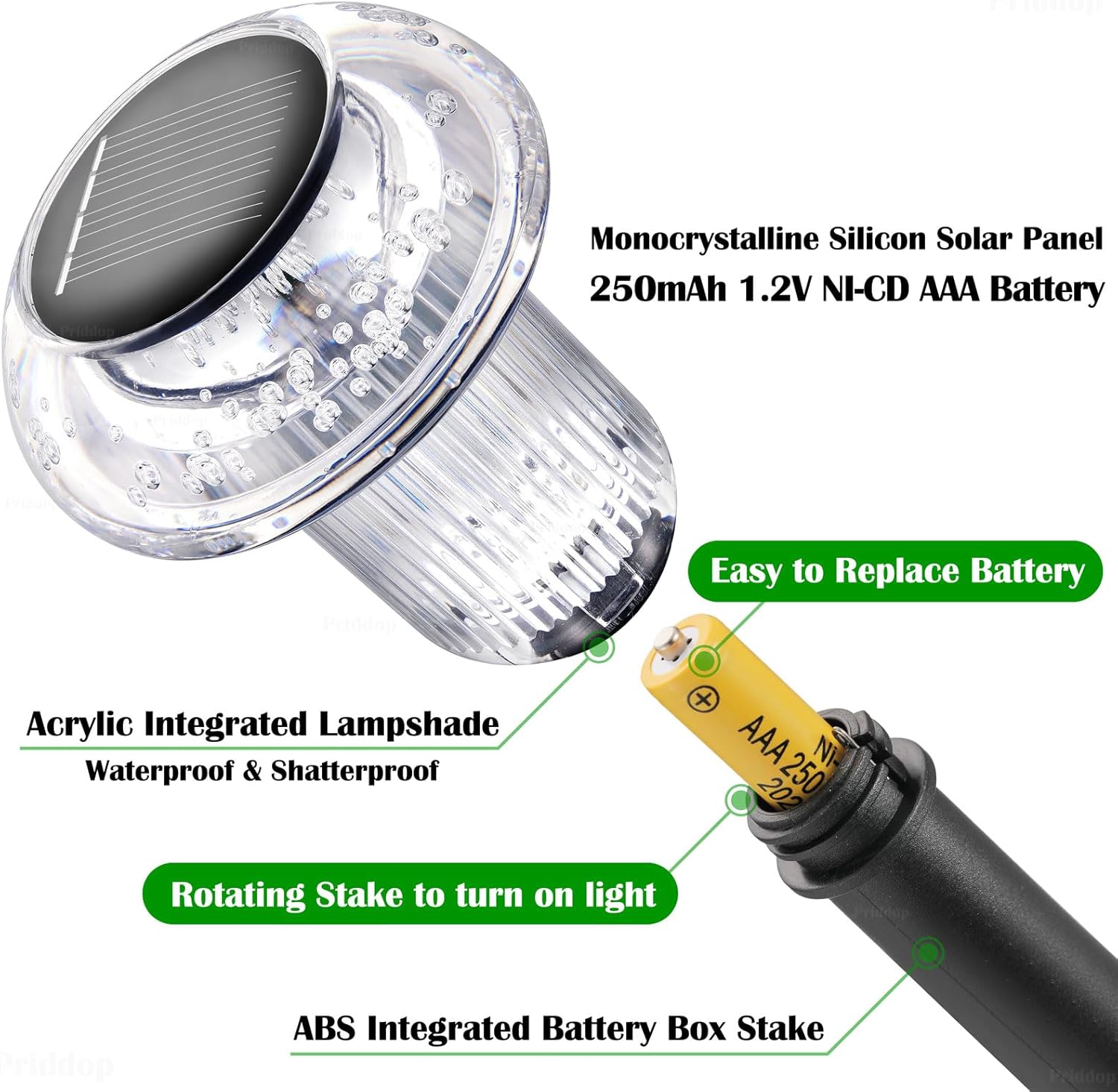 - HIGH EFFECT: Solar pathway lights outdoor adopts monocrystalline silicon solar panel and contains 1.2 V 250 mAh Ni CD AAA Battery. They automatically charge during the day, over a period of 4-6 hours. Then, they turn on automatically at night, providing at 6-8 Hours of lighting.