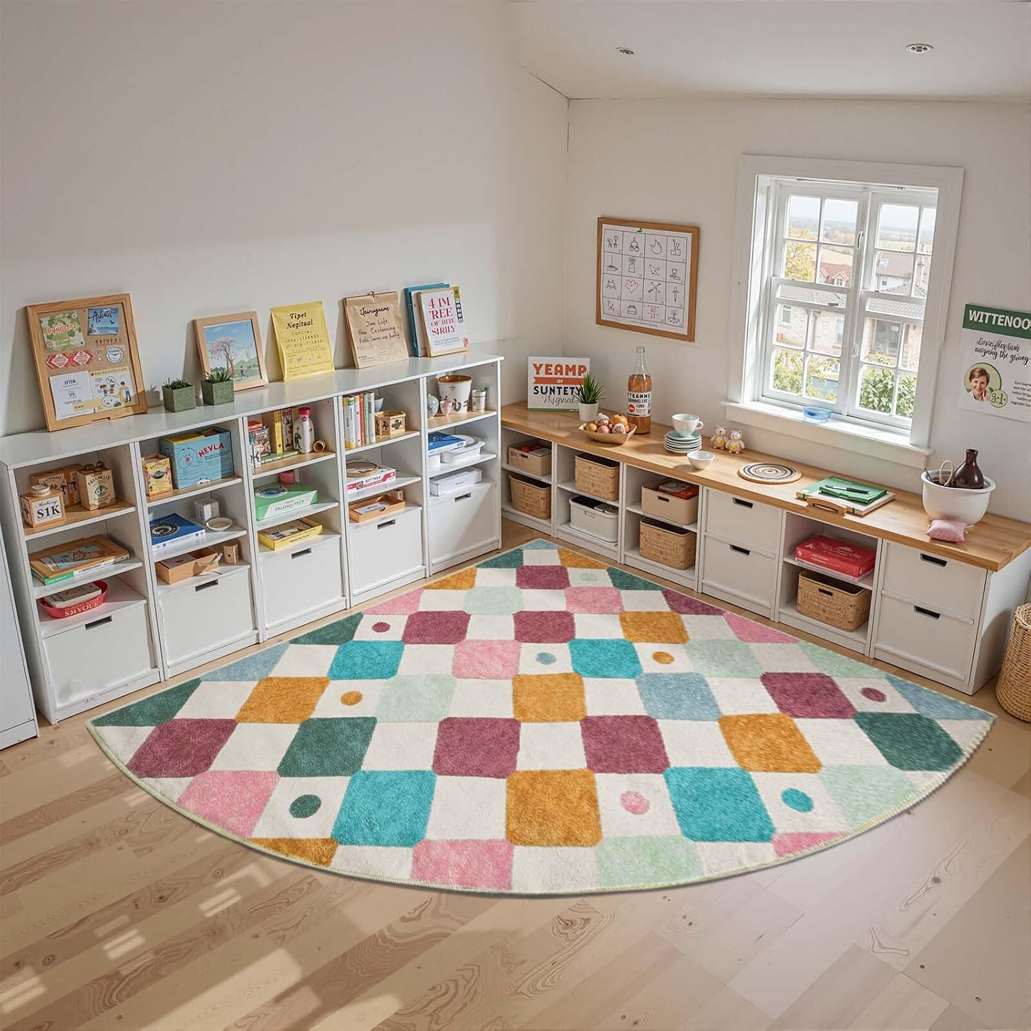 jinchan Kids Rug for Classroom 7ft Radius Corner Washable Area Rug Modern Colorful Quarter Circle Rug Soft Non-Slip Carpet for Nursery Playroom Daycare Reading Nook Living Room Confetti on Cream