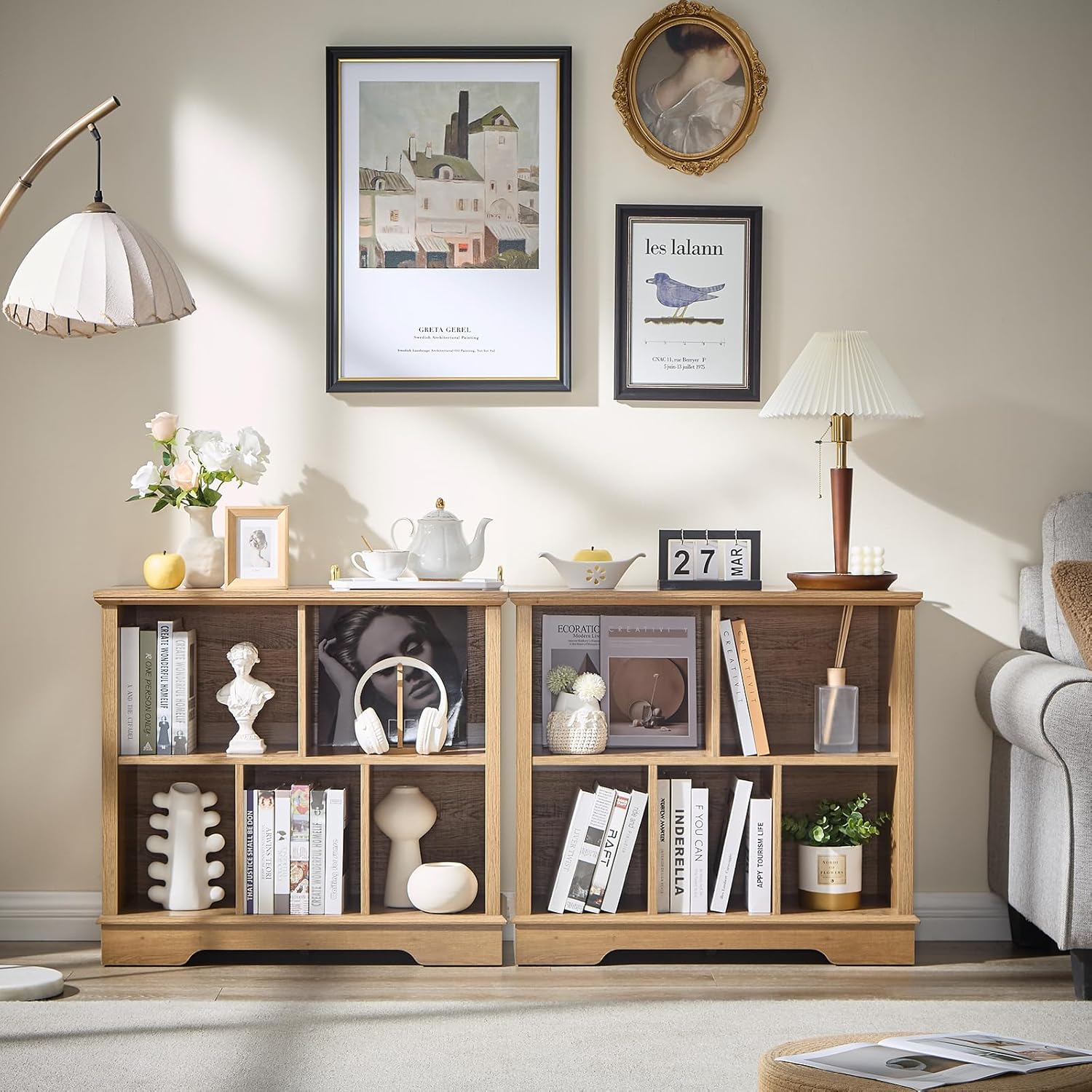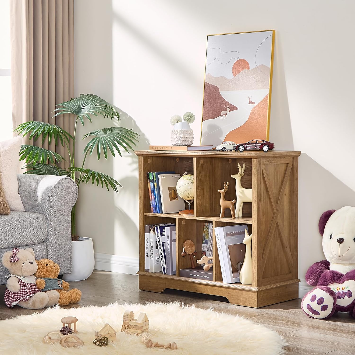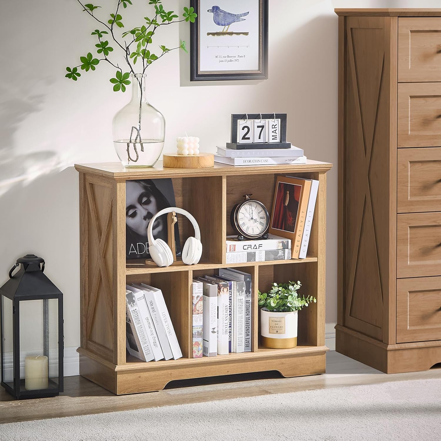 - 5 Cube Storage Space: Our farmhouse-style cube storage bookcase features six spacious compartments, perfect for organizing books, decor, baskets, and more. The rustic X-pattern side panels add a charming touch, seamlessly blending with our existing furniture collection to create a cohesive home decor set. Ideal for living rooms, bedrooms, offices, or closets, this bookcase combines functionality with timeless design