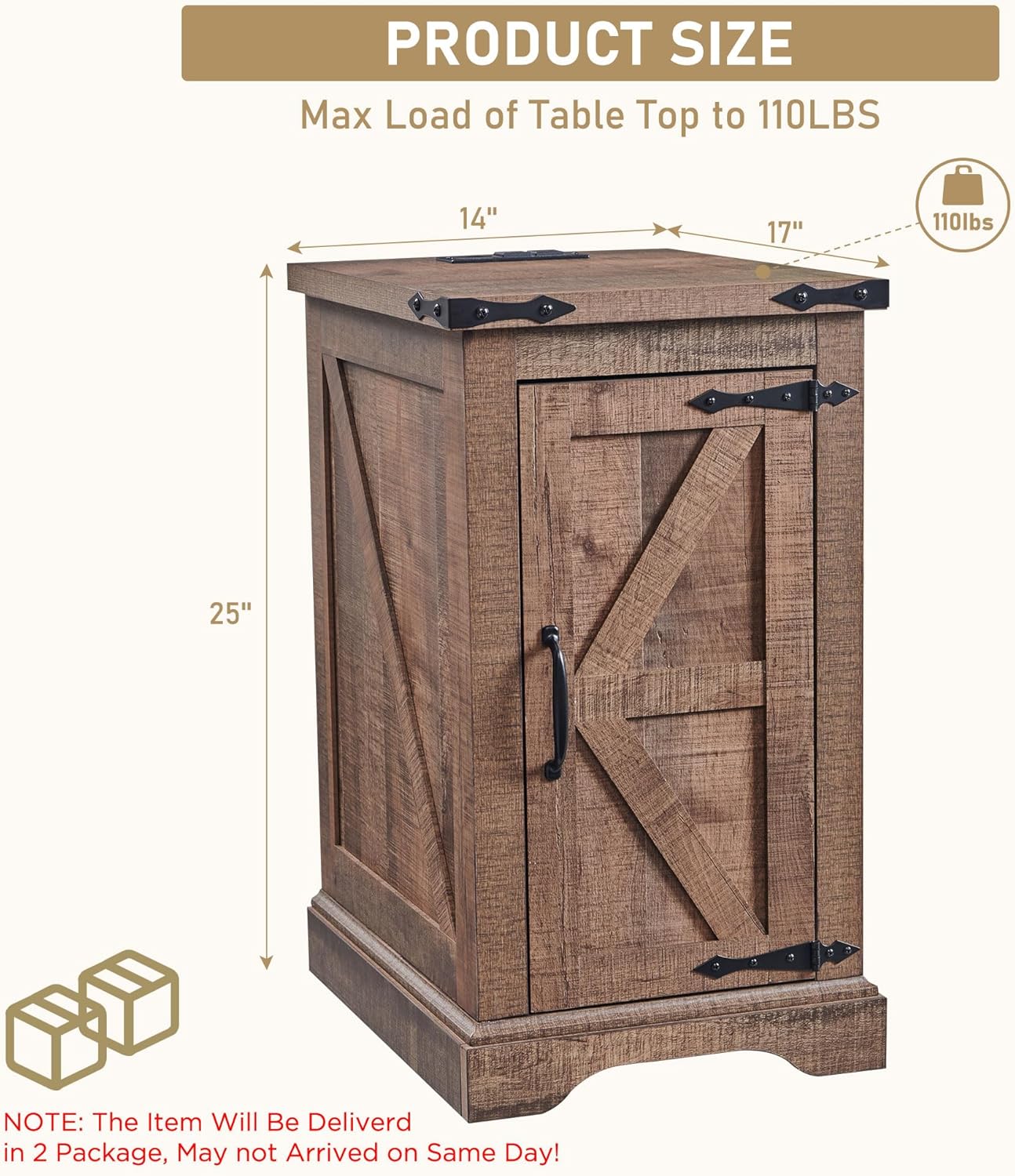 JXQTLINGMU Farmhouse Nightstand Set of 2 with Charging Station, 17"D Rectangular End Table with Barn Door & Adjustable Storage Shelf, Wood Rustic Sofa Side Table for Living Room, Bedroom, Light Brown