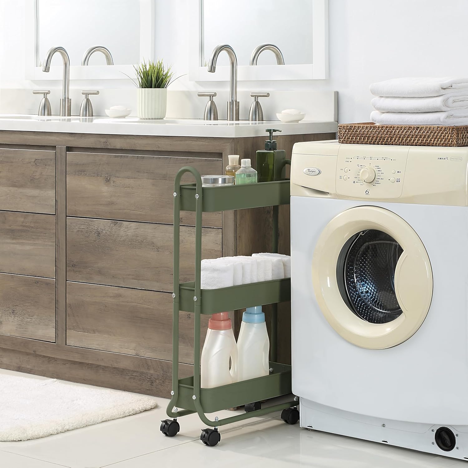 SunnyPoint Slim Rolling Storage Cart, 3 Tier Bathroom Storage Organizer Bathroom, Laundry Utility Cart (Army)
