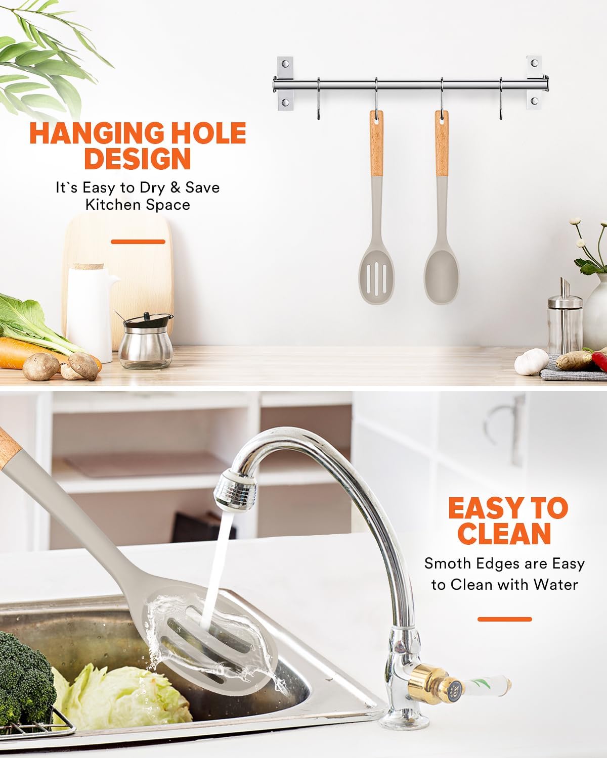 Silicone Cooking Spoons, Great for Scooping Sides and Serving Hearty Stews, BPA-Free Matte Silicone, Wooden Handle Serving Spoon for Nonstick Cooking Surfaces (Khaki)