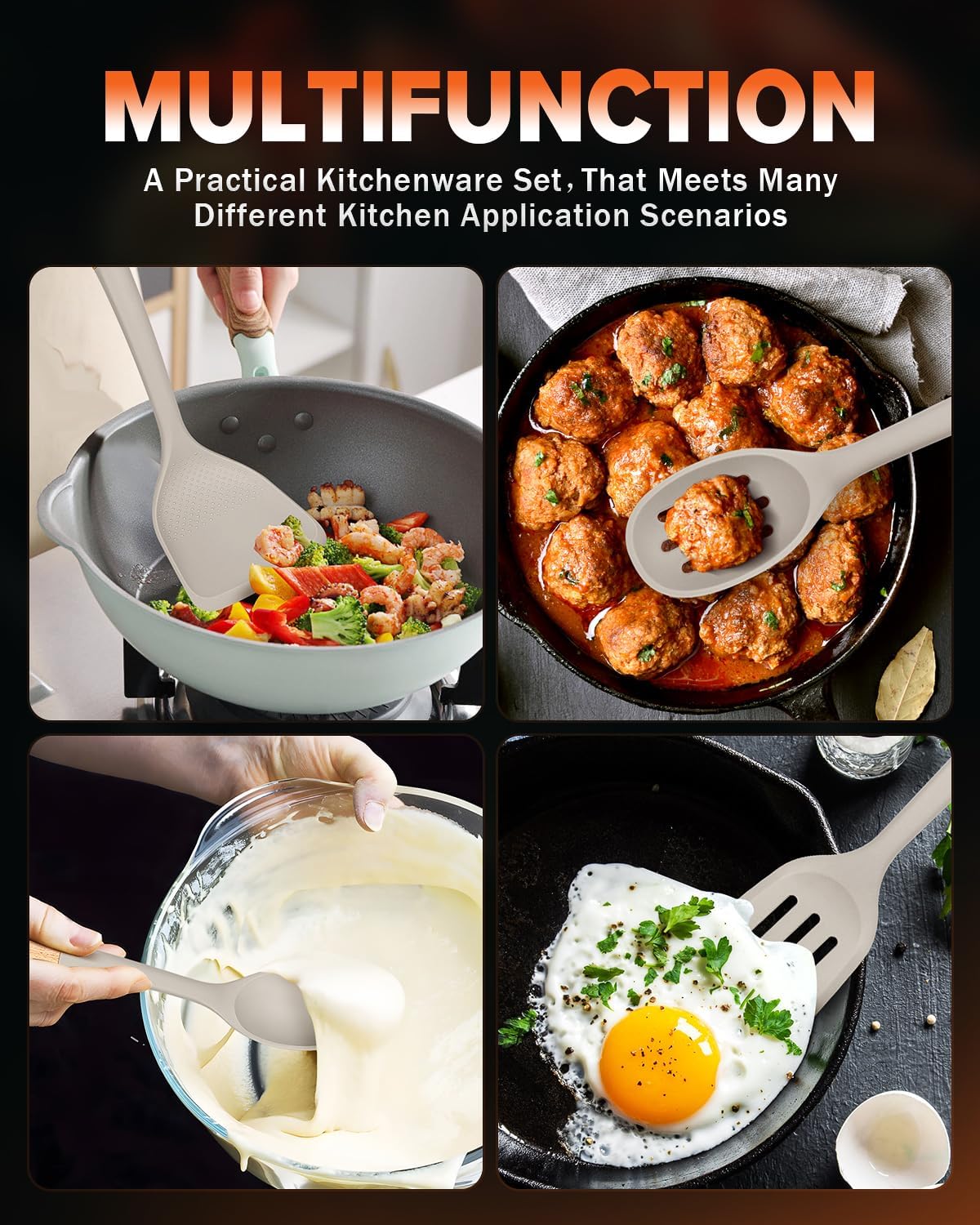 Silicone Cooking Utensils Set, Perfectly Angled for Frying, Mixing,Serving,Draining,Turning and Stirring, BPA-Free Matte Silicone, Wood Handles, Safe for Nonstick Cooking Surfaces,4 Pack (Khaki)