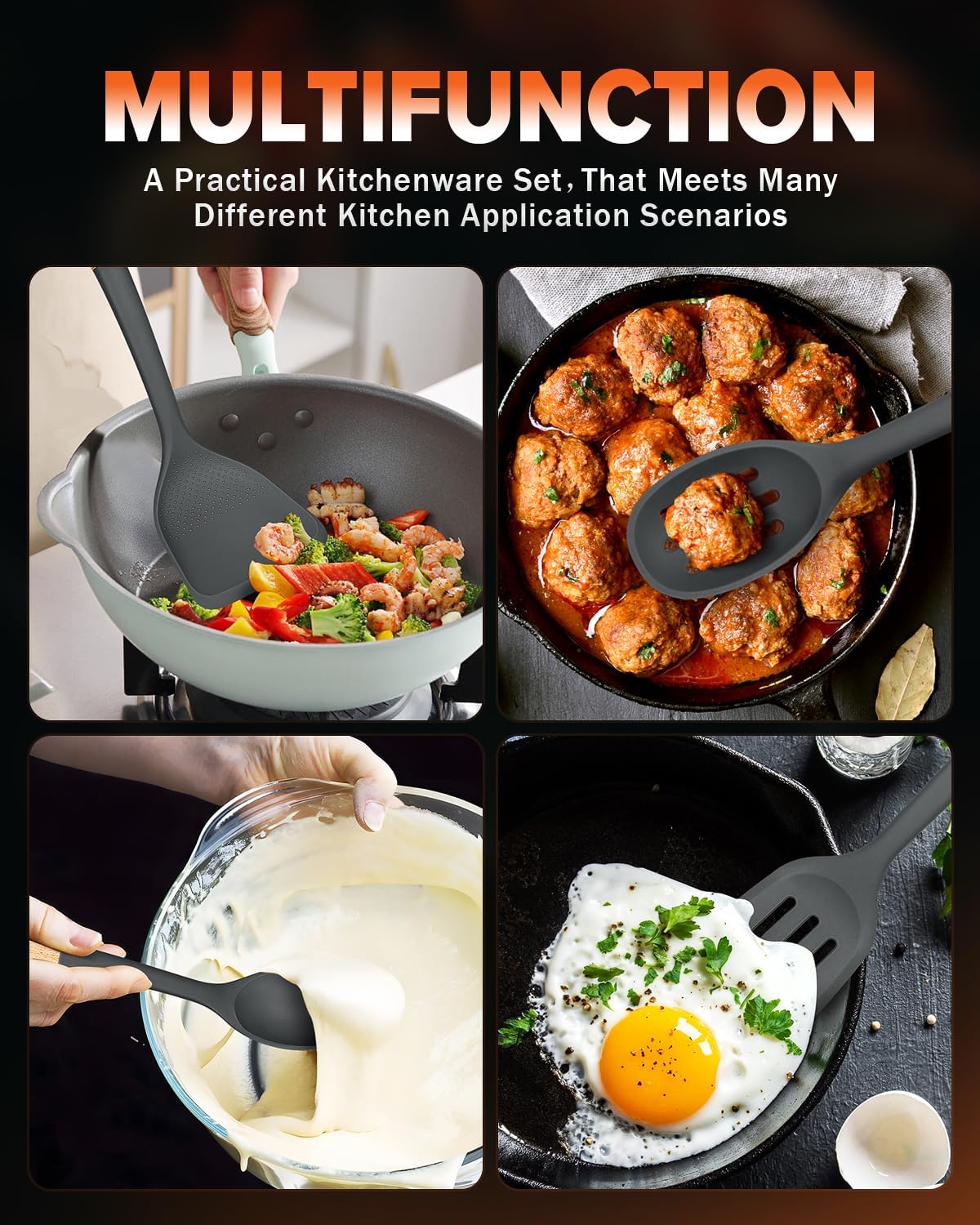 Silicone Cooking Utensils Set, Perfectly Angled for Frying, Mixing,Serving,Draining,Turning and Stirring, BPA-Free Matte Silicone, Wood Handles, Safe for Nonstick Cooking Surfaces,4 Pack (Grey)