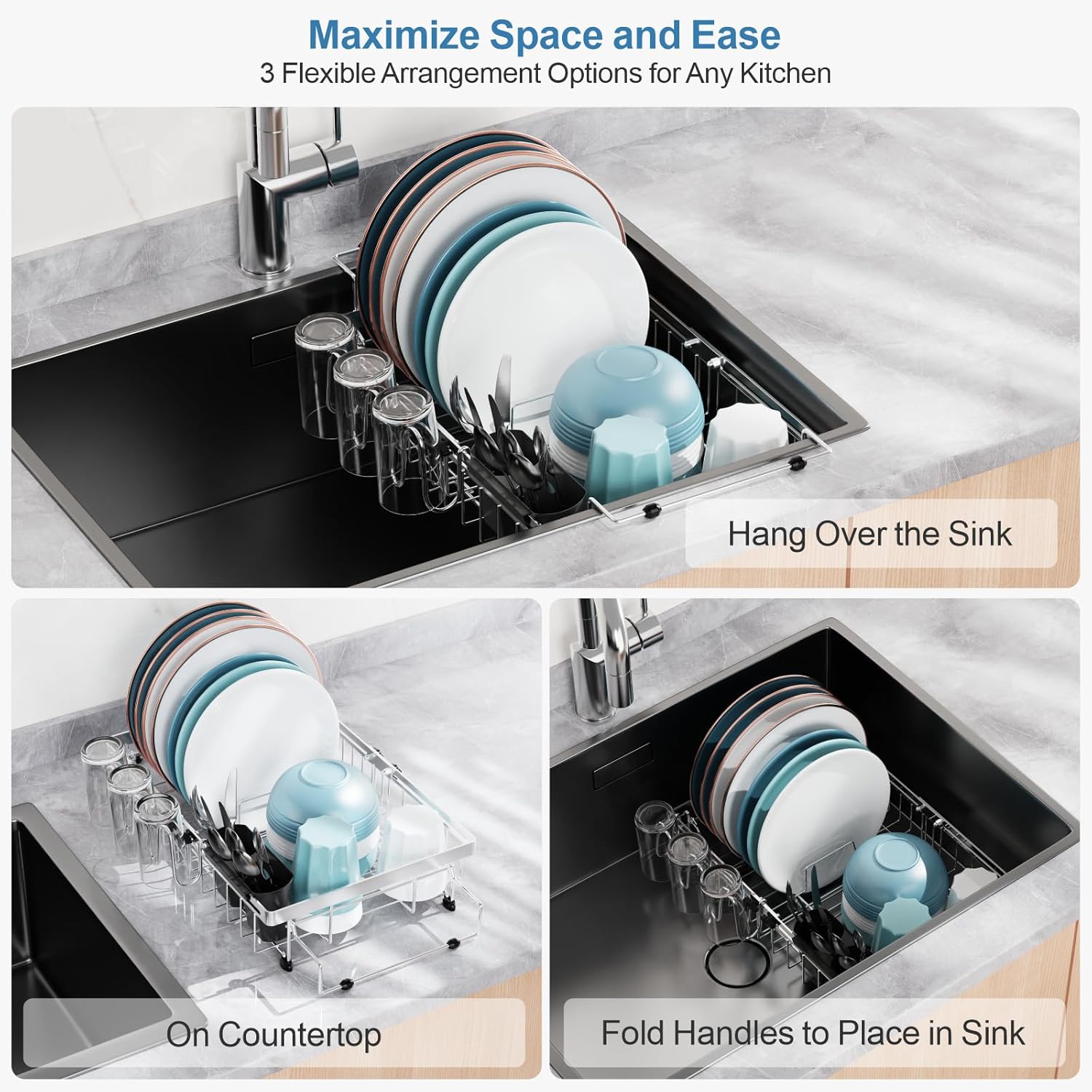 - True Expandable, Real Capacity Boost: Unlike other racks that only extend handles, our dish drainer expands as a whole unitโtruly increasing your drying space, allowing you to comfortably hold at least 3 extra cups in addition to 6 plates, bowls, utensils, and even fresh fruits and veggies. This innovative design not only ensures perfect sink compatibility but genuinely maximizes your drying area